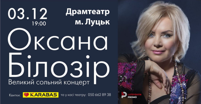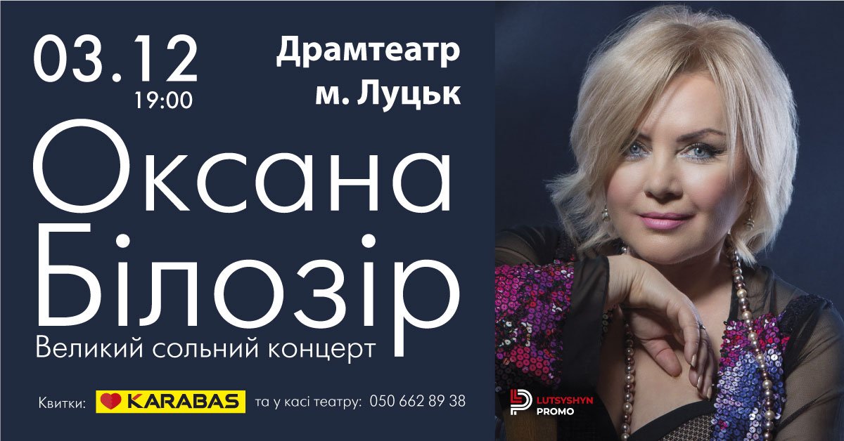 3 грудня Оксана Білозір завітає до Волинського академічного обласного українського музично-драматичного театру імені Т. Г. Шевченка з програмою «Народжена Україною», повідомляють організатори події – компанія Lytsyshyn Promo.