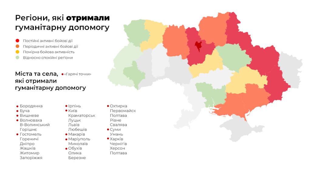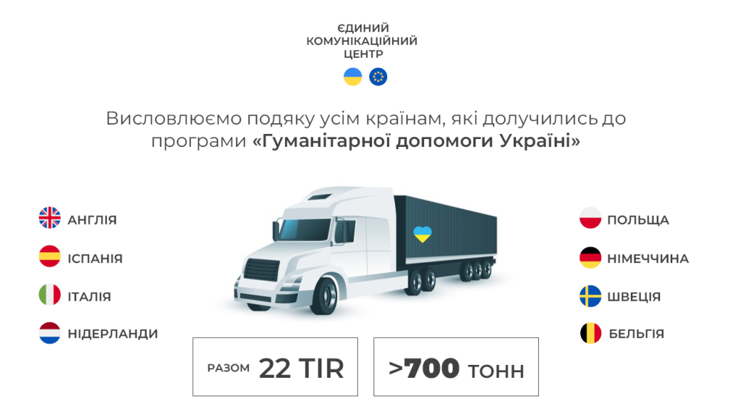 До того ж, Україна отримала майже 700 тонн гуманітарної допомоги від Британії, Іспанії, Італії, Нідерландів, Польщі, Німеччини, Швеції та Бельгії. Координатор Єдиного комунікаційного центру зазначив, що волонтери надсилали чимало листів до цих країн.