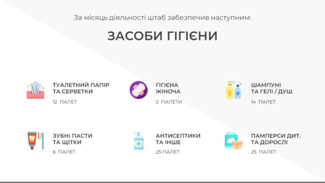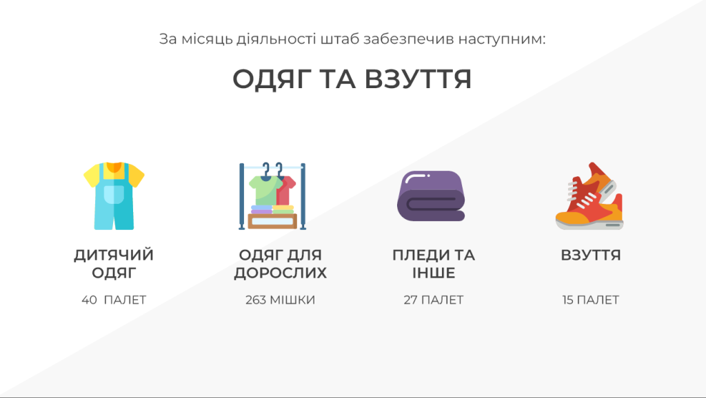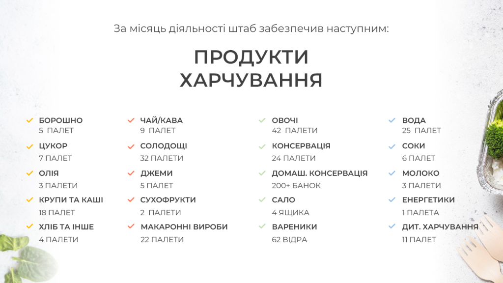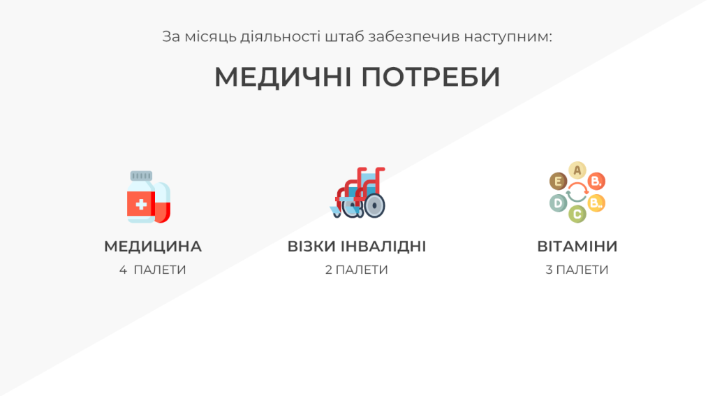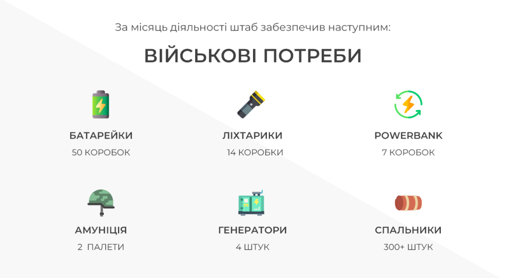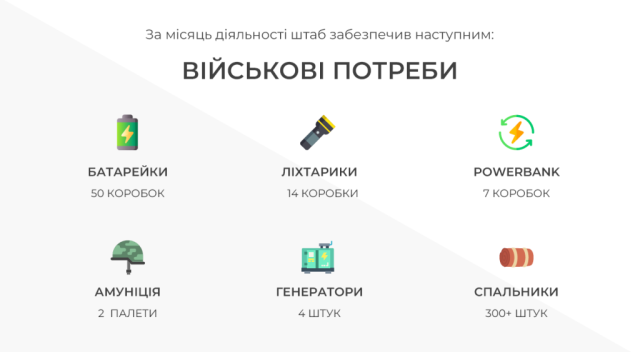 Так, Єдиний комунікаційний центр виконав військові (амуніція, генератори, спальники, батарейки, ліхтарики, powerbank) та медичні потреби (медикаменти, інвалідні візки, вітаміни), забезпечив продуктами харчування, одягом, взуттям та засобами гігієни.