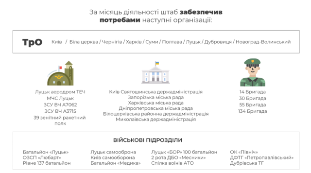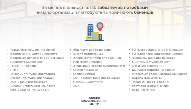 Організації, чиї потреби штаб забезпечив за місяць:Єдиний комунікаційний центр співпрацює з такими волинськими громадами та організаціями: