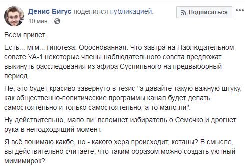 За даними Дениса Бігуса, завтра, 20 грудня, на засіданні Наглядової ради телеканалу «деякі члени Наглядової ради запропонують викинути розслідування з ефіру Громадського на передвиборчий період».