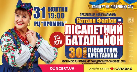 Квитки можна купити за посиланням – https://concert.ua/uk/event/lisapetnii-batalion-i-natalja-falion-lisapetom-nache-tankom.