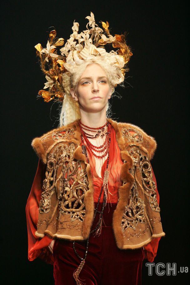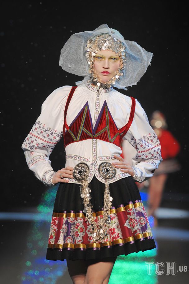 Але ось в зимовій колекції Haute Couture Жан-Поль Готьє поєднував національні вбрання зі шкірою і гуцульськими жилетами.Моделі на подіумі представляють вбрання з колекції Жана-Поля Готьє Haute Couture осінь/зима 2005-2006