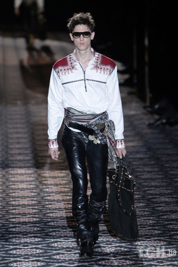 Італійський дім моди на етнохвилі теж вирішив запустити колекцію з вишивкою і зробив це 2008 року. У колекції Gucci вишивку почали носити і чоловіки, а ось на жіночих моделях проглядається лише натяк на неї у вигляді малюнка на шовковій тканині. Також про національні мотиви говорили деякі елементи: пояса, що нагадують крайку і китиці на довгій нитці. Але ось верхній одяг точно нагадував квіти з українських вишивок.Моделі на подіумі представляють вбрання з колекції Gucci осінь/зима 2008-2009