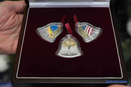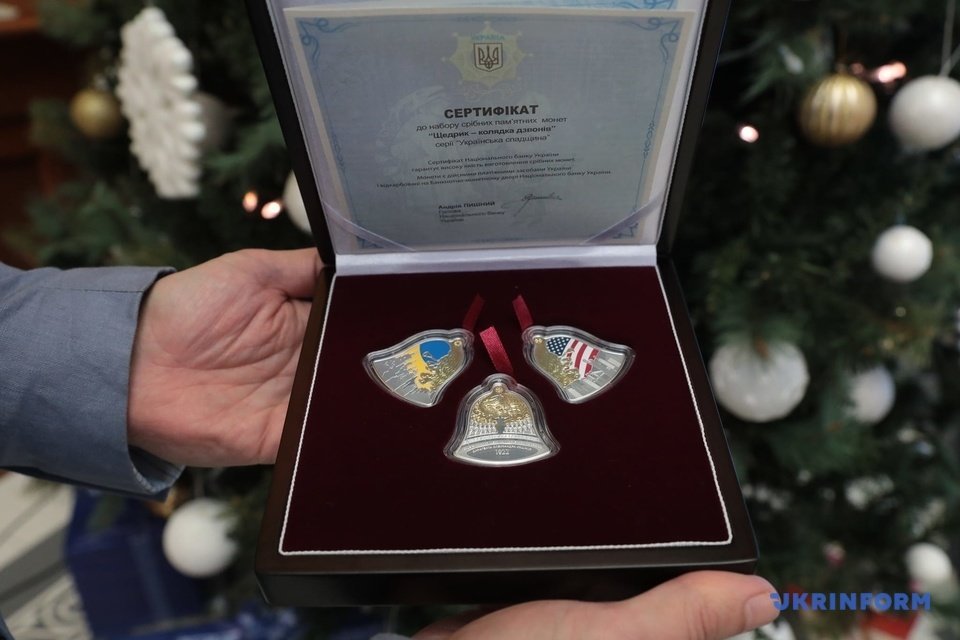 Голова Національного банку України Андрій Пишний спільно із заступником голови Місії США в Україні Робертом Нідемом презентували сьогодні, 21 грудня, набір пам’ятних монет «Щедрик – колядка дзвонів».