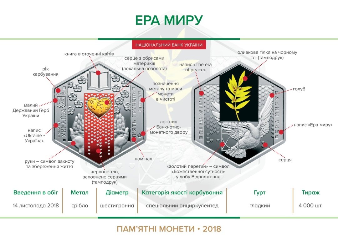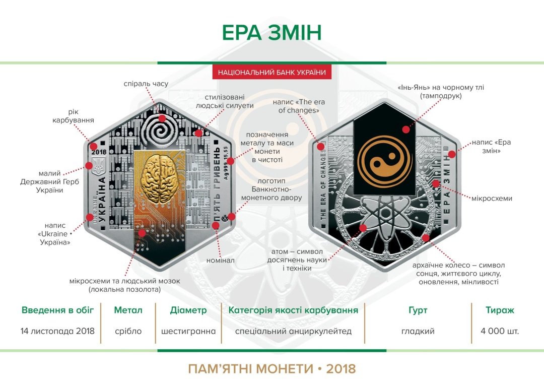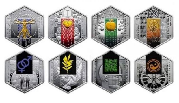 "Набір присвячений науці, кожна монета з нього має свій унікальний сюжет. Монети мають шестигранну форму, вони оздоблені тамподруком (кольоровий друк) та локальною позолотою (на кожній монеті вміст золота не менше ніж 0,0001 г)." - йдеться у повідомленні.