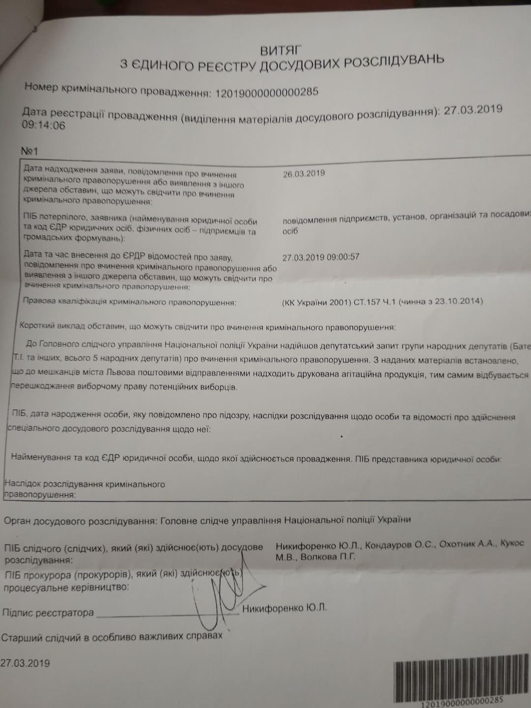 «До Головного слідчого управління Національної поліції України надійшов депутатський запит групи народних депутатів (Батенка Т. І. та інших, всього 5 народних депутатів) про вчинення кримінального правопорушення. З наданих матеріалів встановлено, що до мешканців міста Львова поштовими відправленнями надходить друкована агітаційна продукція, тим самим відбувається перешкоджання виборчому праву потенційних виборців», – сказано у витязі з Єдиного реєстру досудових розслідувань.Як відомо, укропівці повідомляли, що зі ЗМІ вони дізналися про надсилання мешканцям Львівської області листівок з інформаційними матеріалами від імені президента України, у яких ідеться про напрямки перспективного розвитку регіону на 2019-21 роки. Матеріали розробила та надрукувала Рада регіонального розвитку, до них додається анкета й конверт зі зворотною адресою. На думку нардепів від УКРОПу, поширення такої друкованої продукції є маніпулятивною передвиборчою агітацією та збором даних потенційних виборців. Крім того, автори документа звернули увагу, що мінімальний тираж дороговартісних анкет становить 730 тис., карт – 20 тис., брошур – 5 тис. екземплярів.