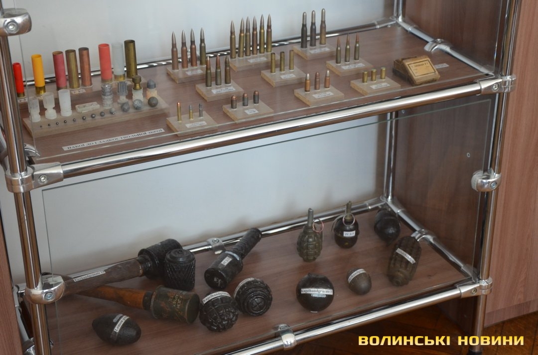 У кабінеті криміналістики представлено вихолощені зразки патронів, мін, гранат тощо. Поруч розміщено майданчик, де проводять навчальні огляди автомобіля, пошуки вибухонебезпечних предметів тощо.«Ми зараз проводимо навчання для територіальної оборони, військових. Також зараз я входжу до складу групи розмінування батальйону оперативного реагування міста Луцька. В разі необхідності ми виїжджаємо і працюємо», – розповів Ігор Гончаров.«У нас триває війна, тому люди повинні знати, що таке, наприклад, касетні бомби, як вони виглядають, адже вони не розміновуються. У нас тут представлено зразок із Бородянки. Також маємо уламки реактивних систем залпового вогню БМ-30 «Смерч», БМ-21 «Град», залишки гранат із зони бойових дій», – прокоментував фахівець з цивільного захисту.