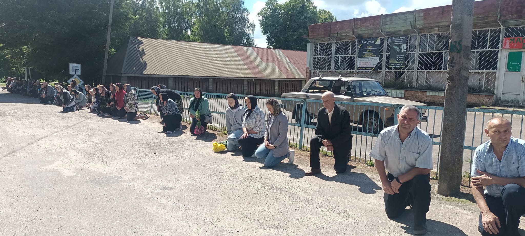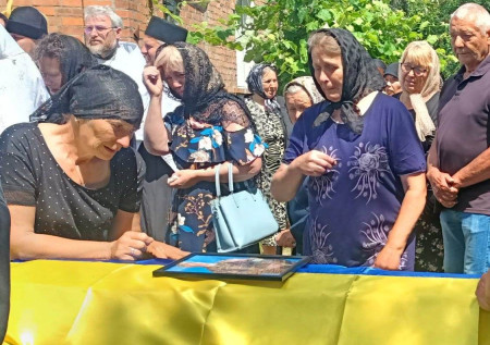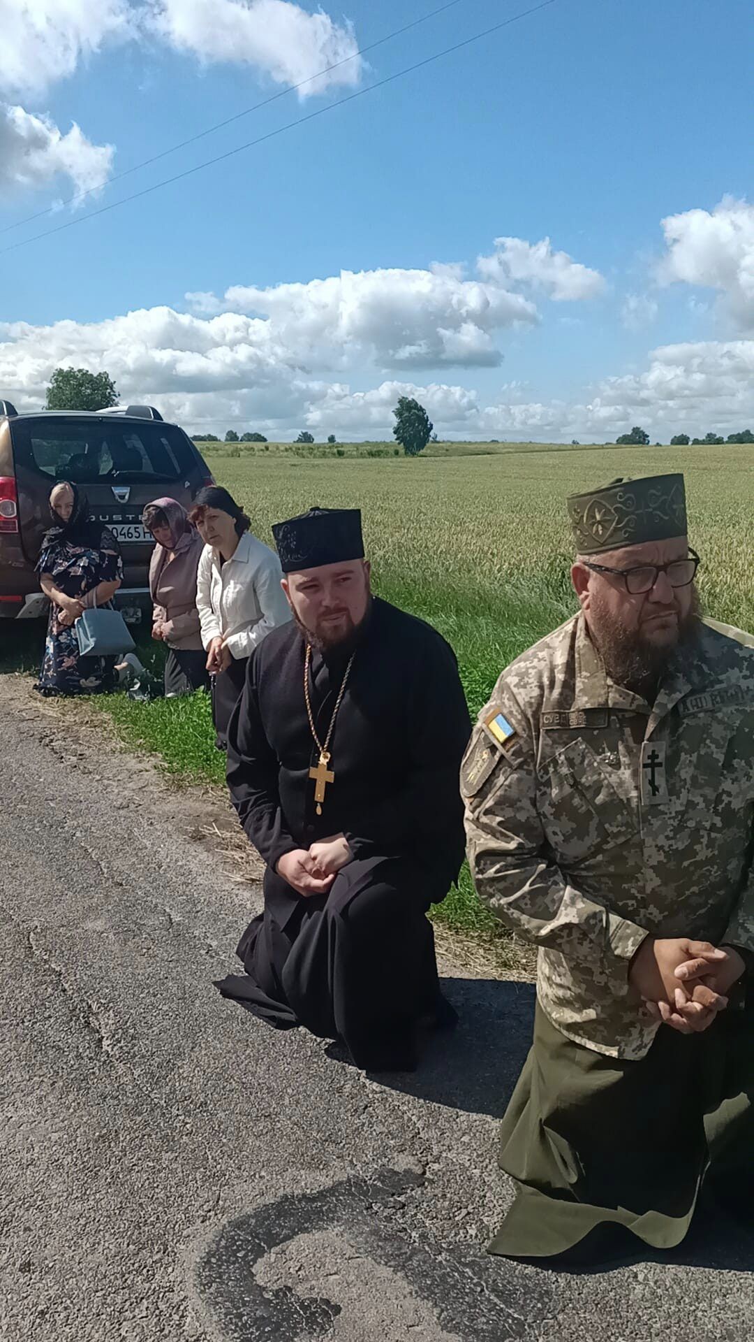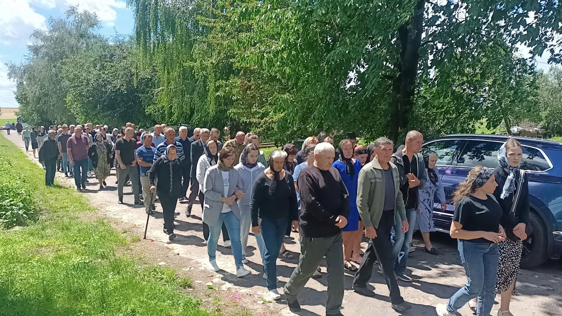 На подвір'ї батьківського дому, куди Герой повернувся востаннє, священнослужителі здійснили чин похорону. Навколішки всі учасники процесії помолилися за душу спочилого Героя.