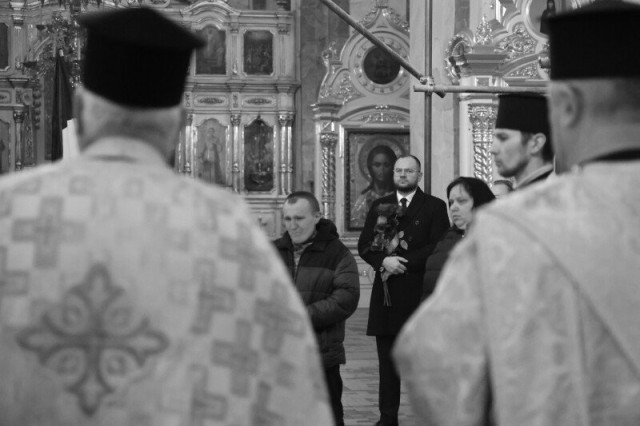 Після завершення богослужіння труну з тілом загиблого захисника пронесли Театральним майданом. Біля пам’ятного фотостенда загиблим Героям траурна процесія зупинилася і виконала Державний Гімн.