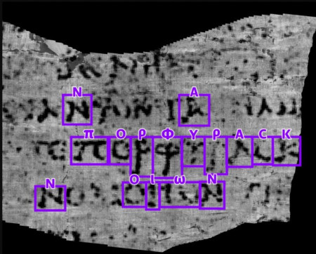 Незабаром ШІ виявив невидимі для людського ока сліди кракелюру (тріщин на пергаменті), а згодом серед них віднайшов літери та натяки на справжні слова.Науковець показав це зображення групі папірологів – вчених, що спеціалізуються на роботах з папірусом. Вони здивувались, бо змогли одразу прочитати слово «porphyras» (пурпурний), попри слабкі літери.