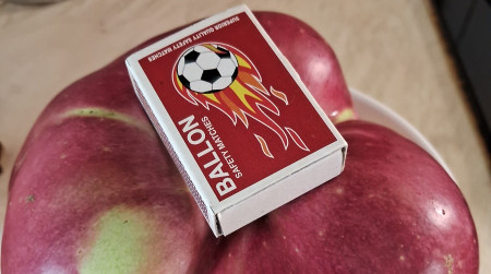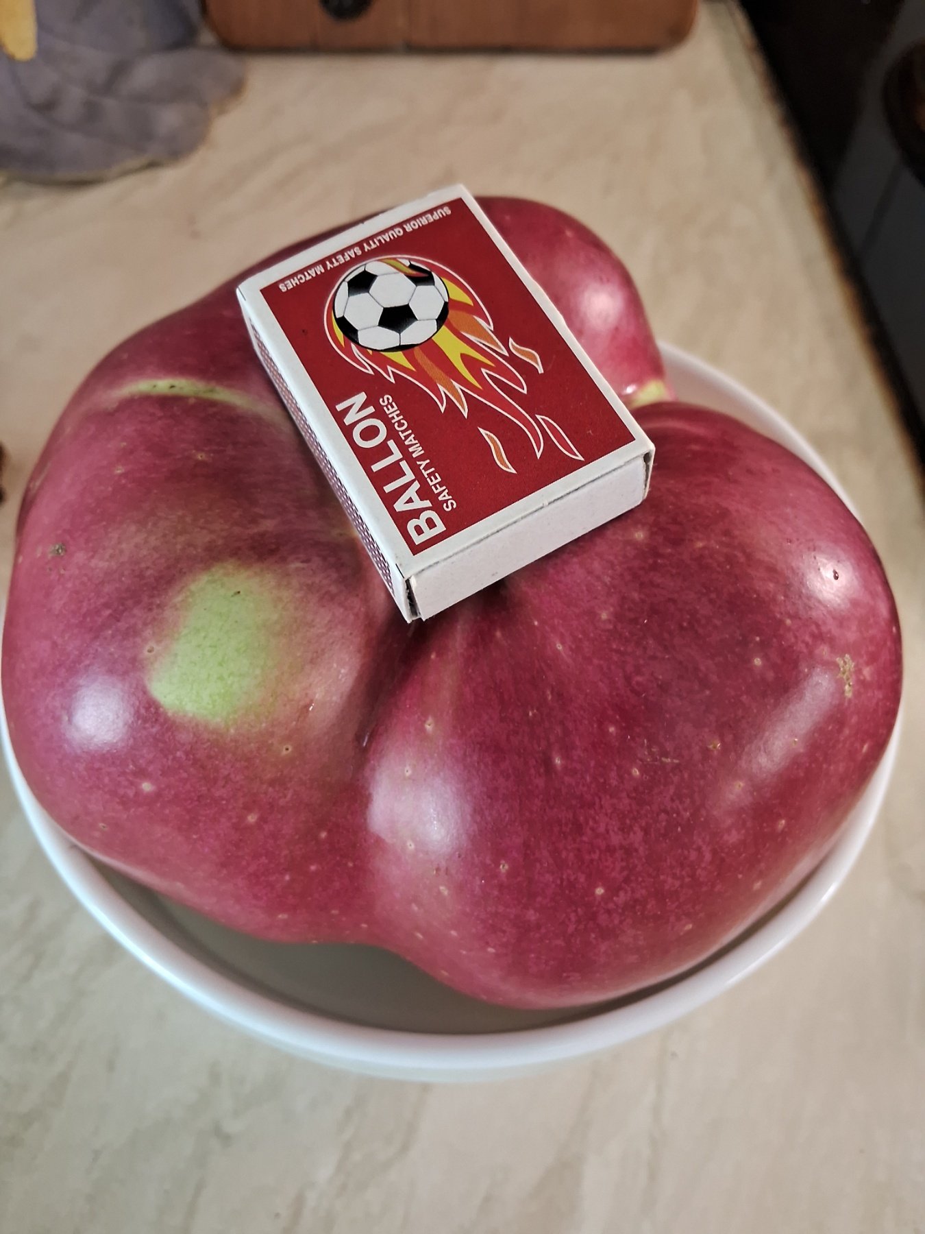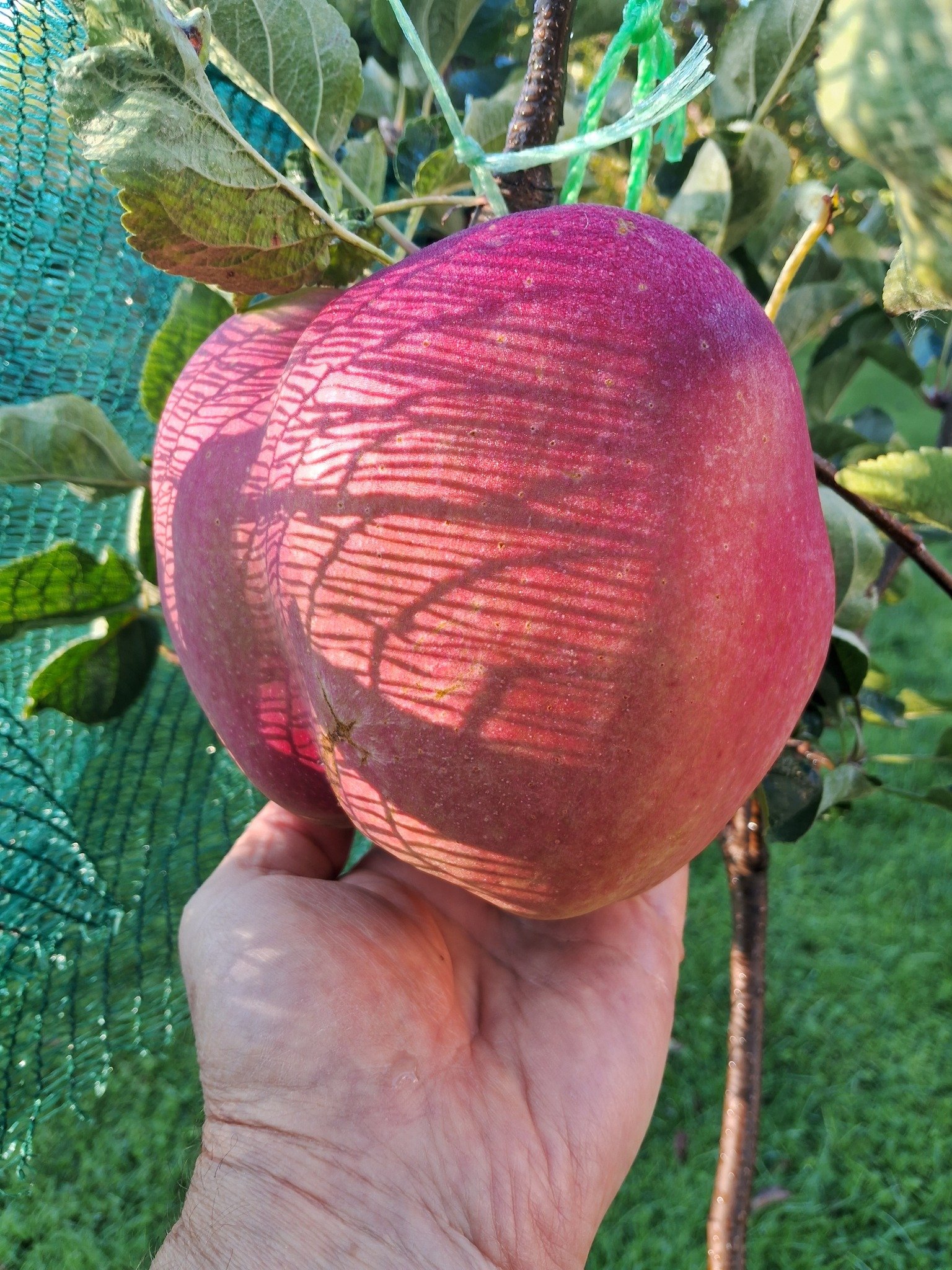 Киянин виростив яблуко завважки 1,281 кілограма, що має обхват 50 сантиметрів. Щоб гілка дерева витримала величезний плід, чоловік використовував підв'язки і ставив підпори з усіх боків.