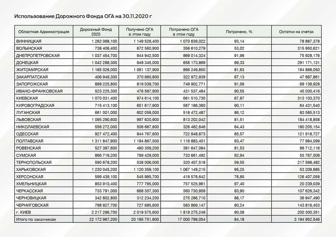«Нагадаю, що 35% Дорожнього Фонду йде в Обласні Адміністрації. В цьому році це 22 млрд грн. Станом на 30 листопада ОДА отримали 20,192 млрд грн. Витратили 17,0 млрнд грн.