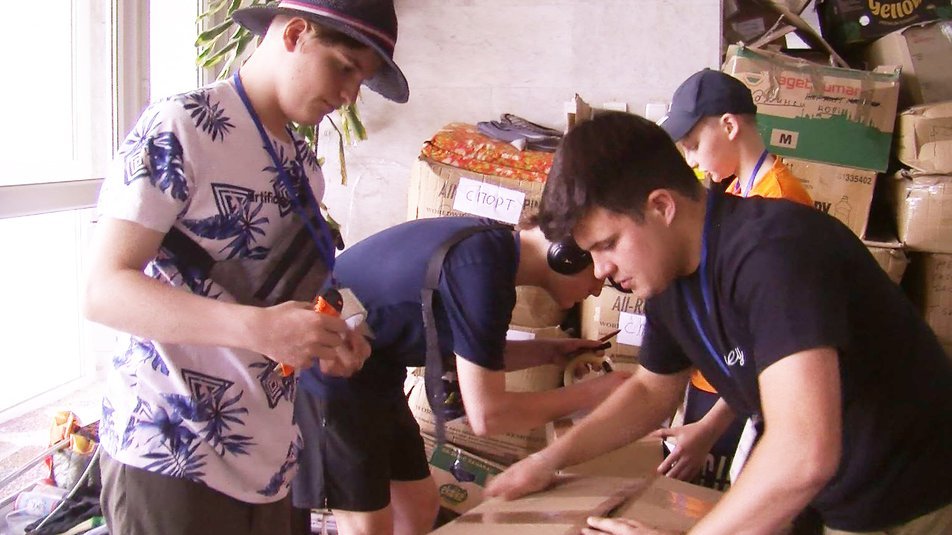 14-річні хлопці-волонтери Дмитро Киндюк та Максим Крючевський носять коробки з гуманітарною допомогою.«У перервах між роботою грають на гітарі та співають, щоб у волонтерському центрі було веселіше», – говорить Дмитро. Додає: виконує лише українські пісні.