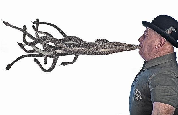 1. Одинадцять гримучих змій зумів втримати в роті за хвіст Джекі Біббі протягом 10 секунд у грудні минулого року. Фото: Barcroft Media