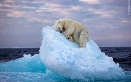 Неймовірний знімок, де молодий білий ведмідь дрімає на уламках крихітного айсберга, що дрейфує в арктичному морі біля узбережжя Шпіцбергена, був зроблений британським фотографом-аматором Німом Саріхані.