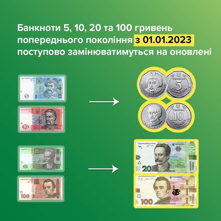 З 1 січня 2023 року НБУ поступово вилучатиме з обігу паперові банкноти номіналами 5, 10, 20 та 100 гривень старого покоління. Замість банкнот зразків 2003 – 2007 років в обіг надійдуть:
