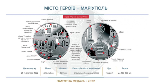 Національний банк України на знак поваги до героїв, захисників та мешканців Маріуполя випустив пам’ятну медаль «Місто героїв – Маріуполь».