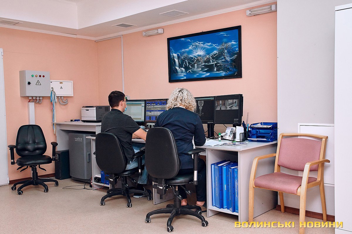 Є в онкоцентрі й сучасний лінійний прискорювач. Він незамінний у закладах такого типу, адже його використовують для проведення променевої терапії.«Цьогоріч нам робили заміну трубки до лінійного прискорювача вартістю майже чотири мільйони гривень, завдяки чому апарат працює безперебійно, хворі мають змогу отримувати сучасну променеву терапію, – провадить Юрій Іванович. – І знову ж таки це було зроблено за сприяння Ігоря Палиці та Ірини Вахович. Якби цю трубку не поміняли, то апарат просто не працював би. Зараз до нас просяться пацієнти з інших областей, де нема лінійного прискорювача».Простій лінійного прискорювача – неприпустимий для медзакладу. Адже променеву терапію тут щодня проходять по 50-55 хворих. Людину обстежують на комп’ютерному томографі, усі параметри передають інженерам-лікарям, вони все розраховують і за їхніми розрахунками апарат проводить опромінення. Тобто апарати, можна сказати, взаємозалежні: якщо зламається томограф, то стоятиме й лінійний прискорювач.До слова, чимала кількість пацієнтів з інших лікувальних закладів проходять діагностику на комп’ютерному томографі саме у Волинському онкоцентрі.