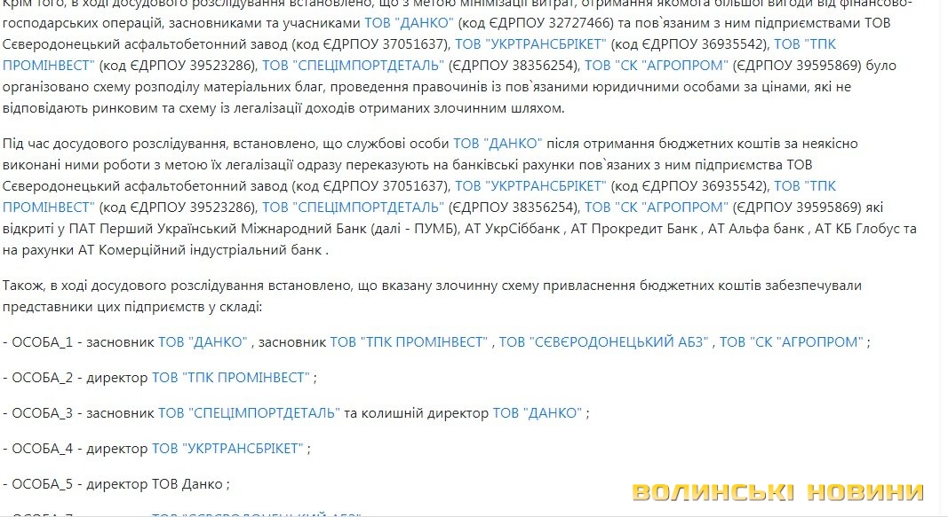 Під час досудового розслідування, встановлено, що службові особи ТОВ «ДАНКО» після отримання бюджетних коштів за неякісно виконані ними роботи з метою їх легалізації одразу переказують на банківські рахунки пов'язаних з ним підприємств ТОВ Сєверодонецький асфальтобетонний завод, ТОВ «УКРТРАНСБРІКЕТ» , ТОВ «ТПК ПРОМІНВЕСТ», ТОВ «СПЕЦІМПОРТДЕТАЛЬ», ТОВ «СК «АГРОПРОМ», які відкриті у ПАТ Перший Український Міжнародний Банк (далі - ПУМБ), АТ УкрСіббанк, АТ Прокредит Банк, АТ Альфа банк, АТ КБ Глобус та на рахунки АТ Комерційний індустріальний банк» .Донецька фірма «Данко» з початку року виграла на Волині тендерів з ремонту доріг на суму понад 200 мільйонів гривень. Часто на дії тендерного комітету надходили скарги: інші учасники заявляли, що тендерні вимоги пишуть так, щоб виграти змогла лише певна фірма – у цьому випадку ТОВ «Данко». Крім того, після першої ж перемоги на тендері, фірма «Данко» активно почала будувати асфальтобетонний завод в Ківерцівському районі. Причому – без жодних погоджень. Землю під завод виділили в облдержадміністрації значно пізніше – коли завод уже працював на повну потужність.