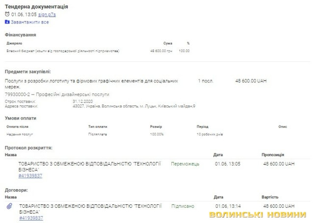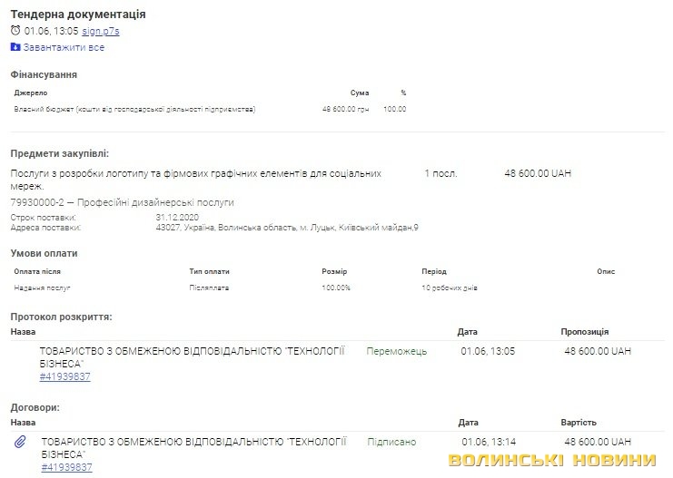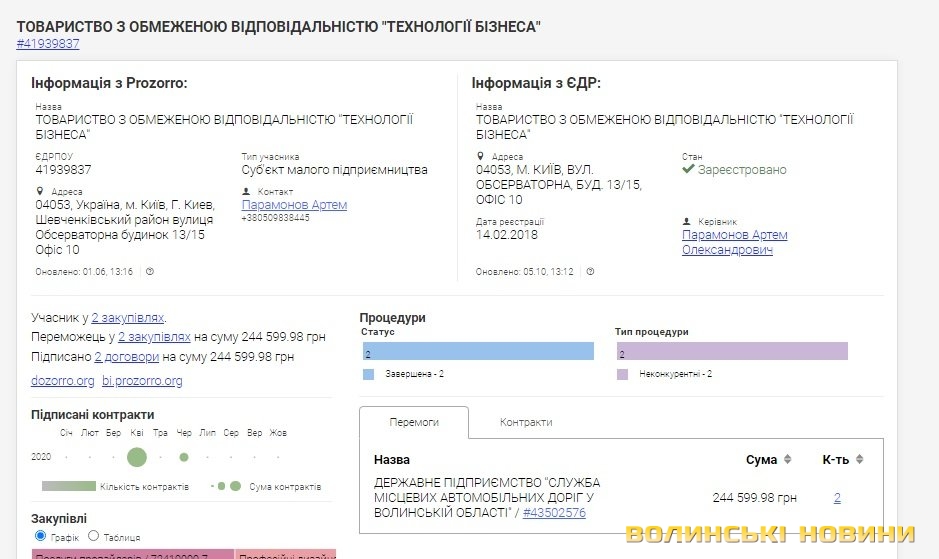 Згодом, це ж підприємство оголосили переможцем іншого тендера на послуги з розробки логотипу та фірмових графічних елементів для соціальних мереж. Сума цієї закупівлі – 48 600 грн.ТОВ «Технології Бізнесу», зареєстроване у Києві, створене у лютому 2018 року. За цей час воно лише двічі брало участь в держзакупівлях. Обидва рази це були тендери, оголошені ДП «Служба місцевих автомобільних доріг у Волинській області».Здавалось би, що тут такого? Хіба трохи ціни завищені. Але цікавіше інше: цей нібито невинний тендер відмінно вкладається в схему роботи держпіжприємства з розпилу бюджетних коштів для потрібних фірм.