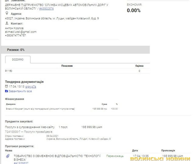 У квітні 2020 року ДП «Служба місцевих автомобільних доріг у Волинській області» оголосило тендер на послуги супроводження Web-сайту. Сума закупівлі 195 999,98 грн. Самого сайту держпідприємство поки немає. Точніше, як пояснили в приймальні, «сайт є, але він ще не дороблений». І коли сайт буде дороблений, там не знають.