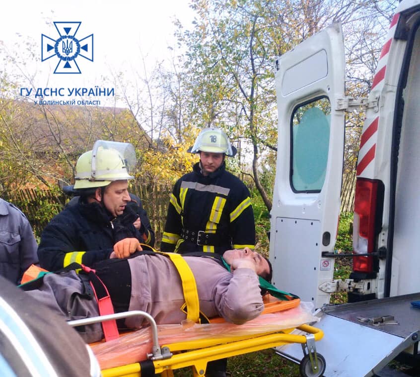 Йому на допомогу прибули рятувальники Державної пожежно-рятувальної частини №18 смт Іваничі. За допомогою висувної драбини і спеціальних ношей бійці ДСНС спустили чоловіка на землю і передали медикам.