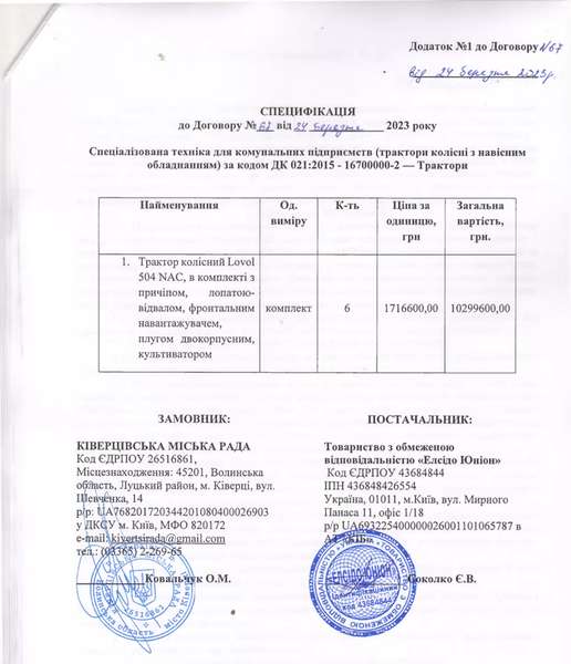 Прямий договір зі столичним підприємством «Елсідо Юніон» про закупівлю техніки Ківерцівська міськрада уклала 24 березня цього року після того, як на першу процедуру відкритих торгів не з’явилося жодного учасника. За умовами угоди разом із шістьма тракторами підприємство мало поставити громаді навісне обладнання, а саме – причепи, лопати-відвали, фронтальні навантажувачі, плуги двокорпусні та культиватори.