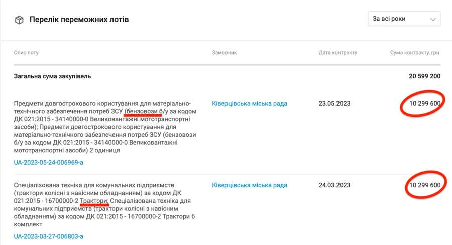 Зазначається, що на час підготовки матеріалу фірма брала участь лише у двох державних закупівлях через «Prozorro». В обох випадках замовником була Ківерцівська міська рада. Закупівлі відбулися навесні 2023-го. Перша стосувалася тих самих тракторів, а друга – двох вживаних бензовозів Renault Premium для потреб ЗСУ. Цікаво, що вони обійшлися громаді у точнісінько таку ж суму, як шість тракторів з навісним обладнанням – 10,3 мільйона гривень.Ні в оголошенні про закупівлю, ні в договорі немає технічних характеристик бензовозів. Проте на сайтах з продажу такої техніки машини пропонують за цінами від 40 до 63 тисяч доларів, що в перерахунку на національну валюту становить від 1,5 до 2,5 мільйона гривень. Натомість Ківерці купили бензовози вартістю у понад 5 мільйонів гривень за одиницю.