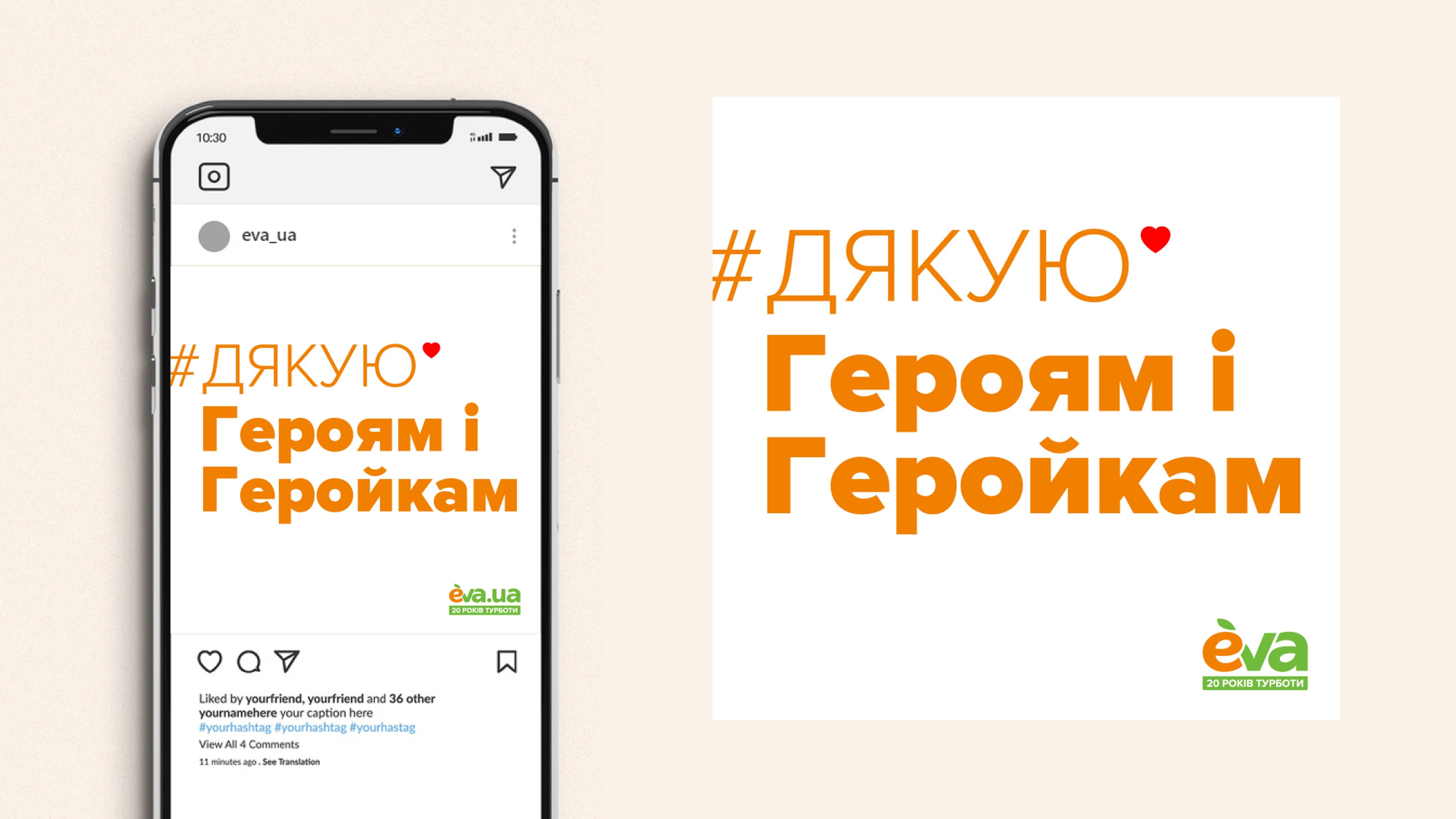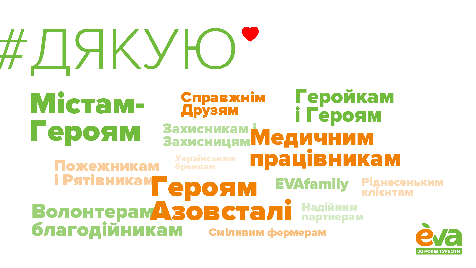 «Майже весь 2022-й рік у EVA мав бути присвячений ювілею, але натомість довелося адаптуватись до війни, стабілізувати бізнес, сконцентруватись на проєктах допомоги ЗСУ, ТРО, волонтерам та медзакладам. До останнього ми не знали, чи варто піднімати тему 20-річчя. Зрештою вирішили, що день народження – це привід звернутися до найдорожчих людей і подякувати їм за підтримку, особливо в такий складний час. Цього року день народження ми не святкуємо, але відзначаємо. Відповідно, обрали соціальну, а не звичну святково-комерційну тематику», – розповіла про суть концепції директорка з маркетингу ТОВ «РУШ» (EVA та EVA.UA) Ганна Гришина.Головною ідеєю та основою цьогорічної кампанії до дня народження EVA стала подяка не лише клієнтам, працівникам та партнерам. Компанія також висловлює вдячність ЗСУ, ТРО, прикордонникам та розвідці; медичним працівникам; пожежникам та рятувальникам; волонтерам та благодійникам; героям та геройкам «Азовсталі»; українським підприємцям, що продовжують працювати; сміливим фермерам; просто друзям України – отже, всім, завдяки кому наша держава продовжує жити і дає відсіч ворогові.«На першому етапі кампанії #ДЯКУЮ ми не спонукали до якихось дій чи реакцій, а просто хотіли зацікавити людей, привернути увагу, подякувати від щирого серця», – пояснює Ганна Гришина.