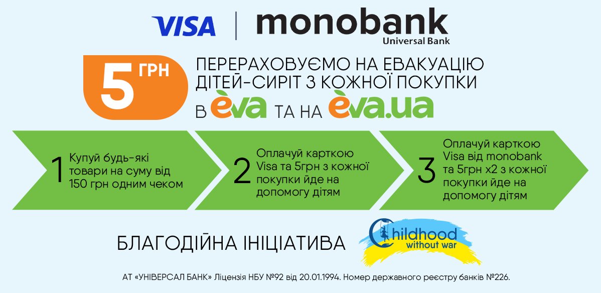 З 1 вересня у своїх соцмережах EVA запустила своєрідну естафету подяки та закликала всіх долучитися. Для цього треба у Facebook або Instagram написати власну історію подяки та позначити її хештегом #Дякую. Найзворушливіші дописи EVA публікуватиме на своїх сторінках та на сайті, аби ними могло надихнутися якомога більше людей. «Певну кількість історій ми вже зібрали самостійно і будемо розміщувати їх на своїх ресурсах. Проте дуже сподіваємось, що клієнти мають їх набагато більше і залюбки ними поділяться», – додає Ганна Гришина.В рамках основної частини кампанії #ДЯКУЮ до дня народження EVA реалізує також благодійну ініціативу спільно з партнерами Visa та Monobank. З 1 до 30 вересня 5 грн з кожної покупки на суму від 150 грн, оплаченої карткою Visa, буде відправлено на підтримку проєкту «Дитинство без війни». З 5 вересня у разі оплати таких покупок карткою Visa від Monobank суму перерахувань на користь дітей-сиріт, евакуйованих до Туреччини, буде подвоєно.Звичайно ж, день народження EVA і цього року не обійдеться без спеціальних пропозицій для клієнтів у магазинах, в мобільному додатку та на EVA.UA. З усіма знижками та приємними сюрпризами, що діють онлайн, можна ознайомитись на спеціально створеному лендингу. Для власників карток VISA додатковим стимулом робити покупки на сайті EVA.UA стане 5% знижка на замовлення від 150 грн. Користувачі