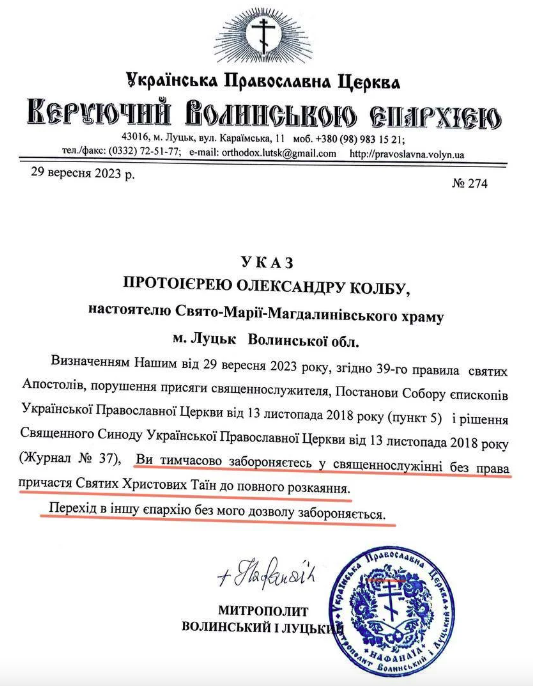 Приміром, настоятель луцької церковної громади Свято-Марії Магдалинівського храму Олександр Колб взагалі отримав таку заборону ще до переходу. Причиною цьому стало співслужіння з представником Константинопольського патріархату.Це лише каталізувало процес і громада стала першою у Луцьку, яка повністю офіційно перейшла в лоно ПЦУ.