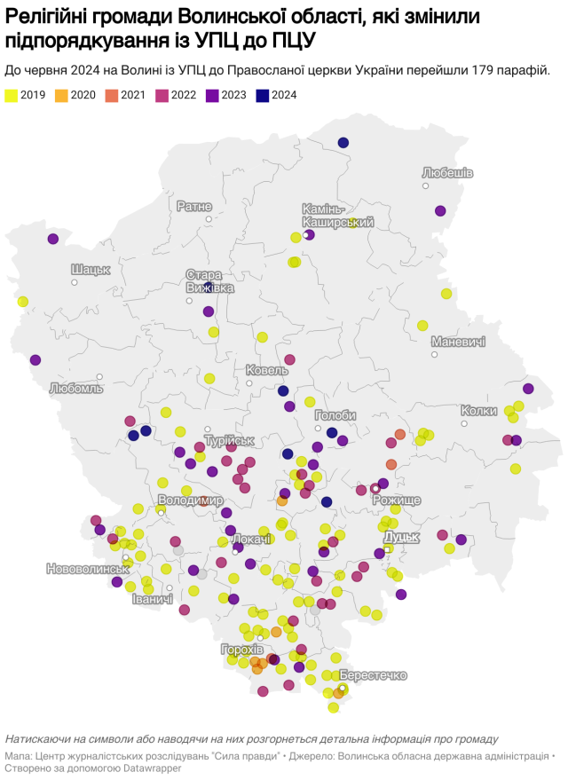 «Я думаю, що є різні ситуації. Може, хтось щиро переходить, скажімо, він дуже патріотично налаштований, думає, що там робить щось таке патріотичне, я не відкидаю. Хоча якщо я, наприклад, в УПЦ молюся за воїнів, нашу державу, збираю допомогу, займаюся волонтерством… То хіба я тут не можу так само допомагати? Ну, гаразд, хочуть — будь ласка, я розумію. Але я не відкидаю, що якісь одиниці можуть бути перебіжчики, які бігають туди-сюди. Є й такі. Просто бігають. Ну, хай бігають, це їхня справа», — каже протоієрей Олександр Кратюк.Згідно з даними департаменту культури, молоді та спорту Волинської облдержадміністрації, упродовж 2019-2024 років 179 релігійних організацій змінили своє конфесійне підпорядкування з УПЦ на ПЦУ. 77 з них зробили це після початку повномасштабного вторгнення Росії.«У 2022 році 45 релігійних громад змінили свою конфесійну прилеглість, у 2023-му таких громад було 23. З початку цього року і до сьогодні 9 парафій змінили конфесійну підлеглість. Є і такі, які подали документи. Зараз вони на розгляді, по них так само ухвалюватимуть рішення», — каже завідувач сектору із питань релігії і національностей департаменту культури, молоді та спорту Волинської ОДА Василь Гайдук.На Волині Православна церква України представлена двома єпархіями: Волинською та Володимирською.