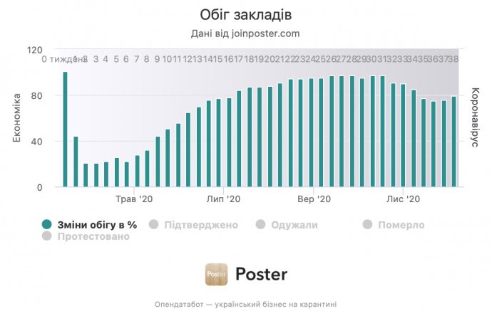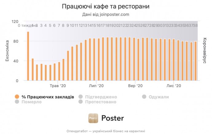 За тиждень без карантину вихідного дня не всім закладам громадського харчування вдалося відновитися. Зараз обіги ресторанів становлять лише 93% від тих, що були до введення карантину вихідного дня.