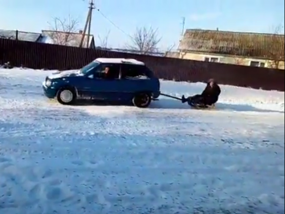 Небезпечні катання: волиняни прив’язали санки до авто. Відео