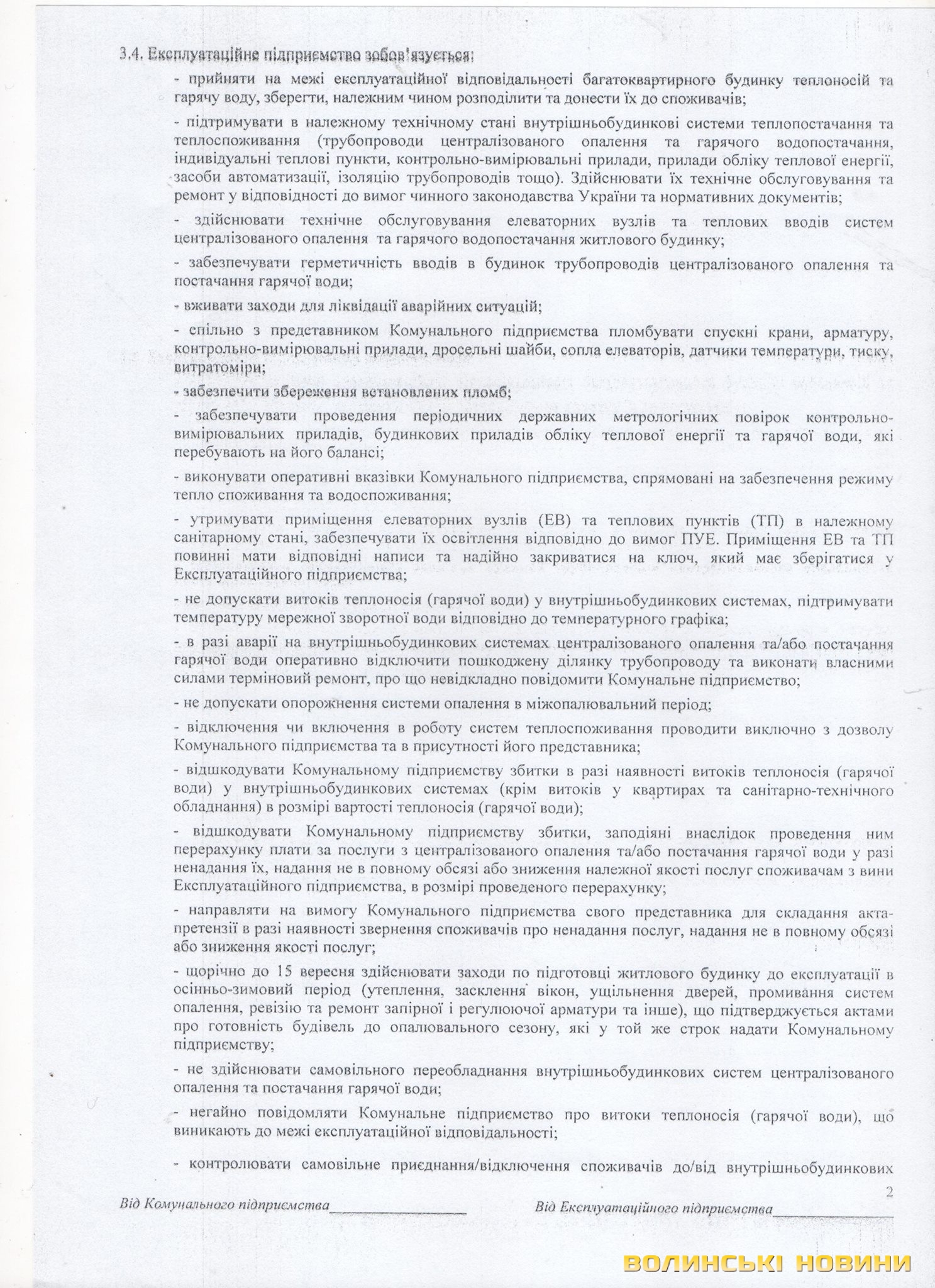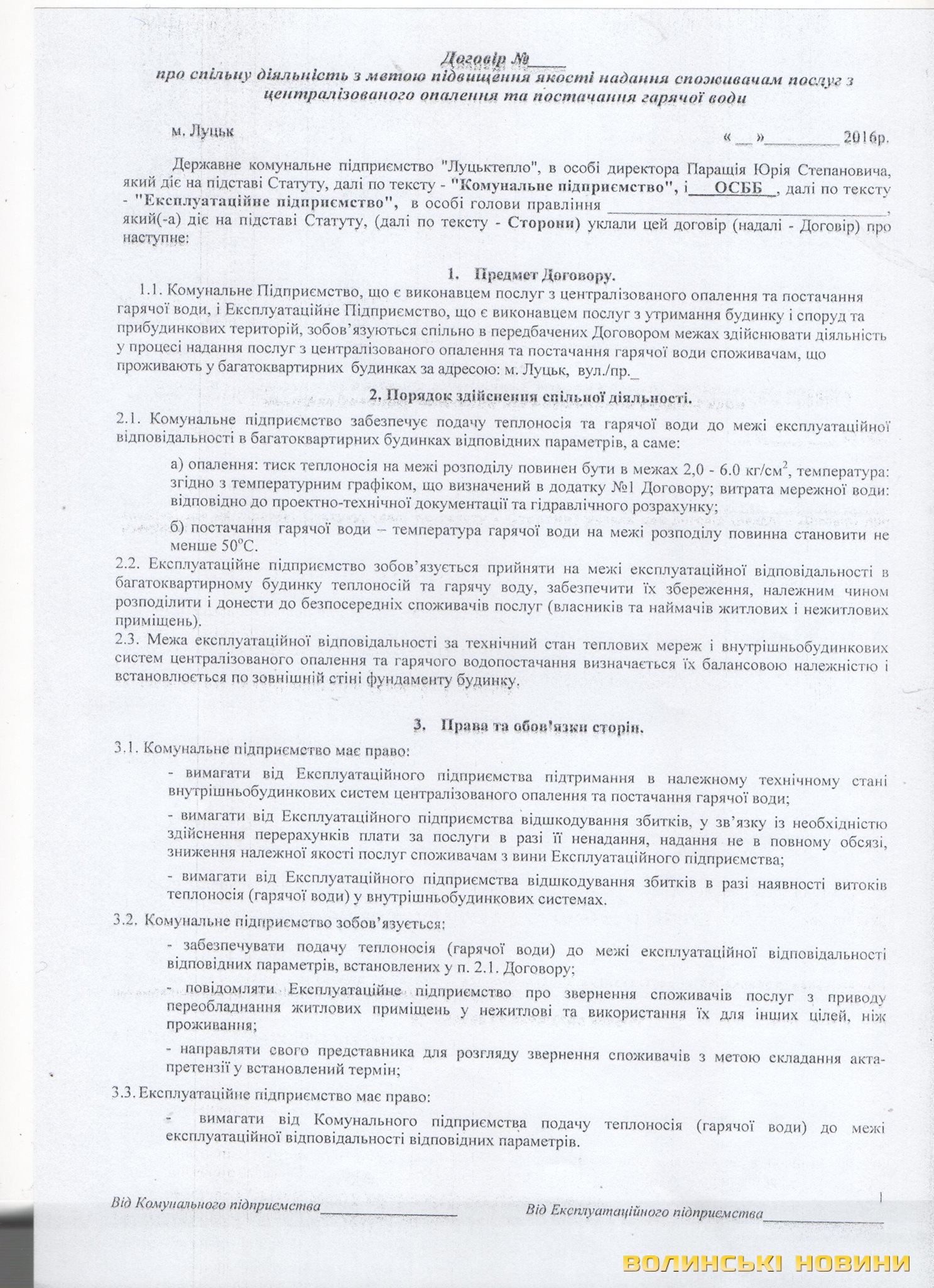 Просимо також вказати, які саме порушення належного технічного стану внутрішньобудинкових мереж системи гарячого водопостачання, вчинені з вини ОСББ, призвели до неподачі гарячої води мешканцям вищевказаних квартир, якими документами (Актами встановлених порушень тощо) та коли дані обставини зафіксовані», - йдеться у зверненні.Іншу точку зору стосовно цього договіру мають комунальники. Так, директор ДКП «Луцьктепло» Валентина Малютіна наголошує, що вони не мають жодного відношення до внутрішньо будинкових мереж. З її слів, їх обслуговують ЖЕКи, а ті будинки, які створили ОСББ, повинні брати на обслуговування мережі, які поки вважаються нічийними.