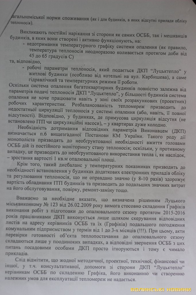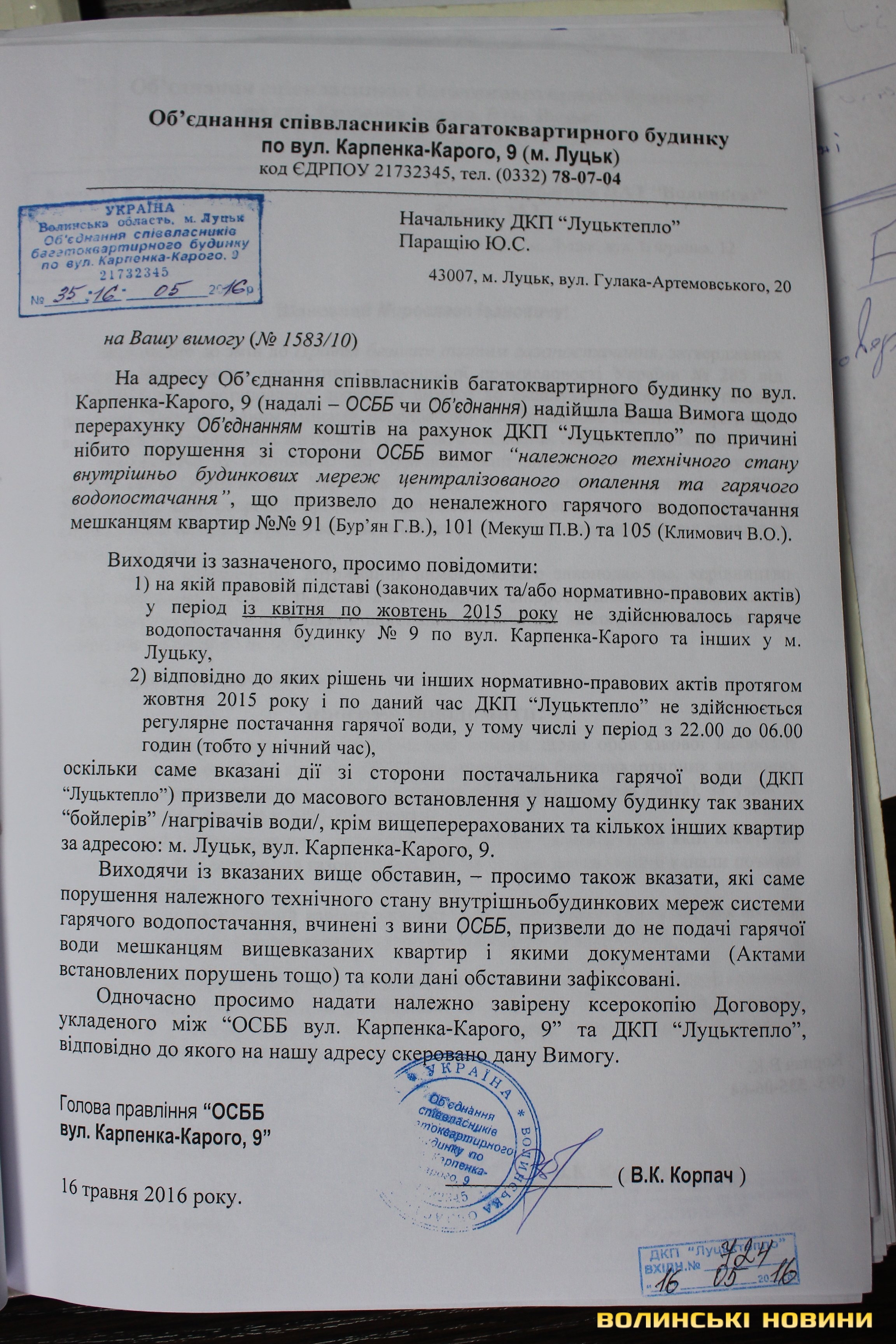 «На адресу об’єднання співвласників багатоквартирного будинку по вул. Карпенка-Карого, 9 надійшла ваша вимога щодо перерахунку об’єднанням коштів на рахунок ДКП «Луцьктепло» по причині, нібито, порушення зі сторони ОСББ.