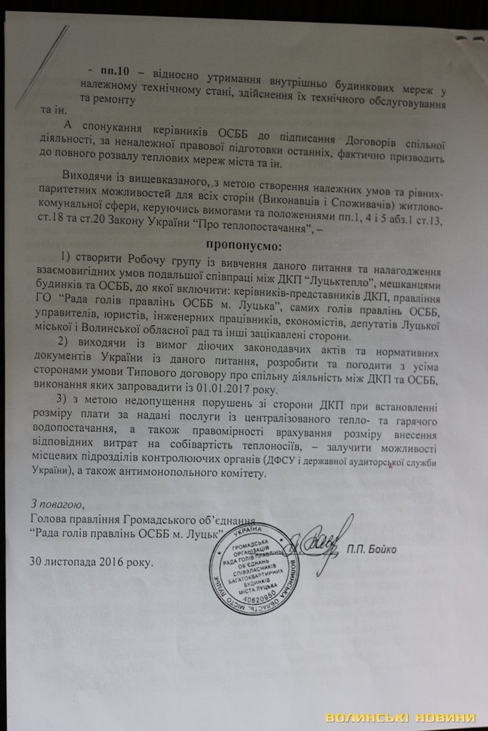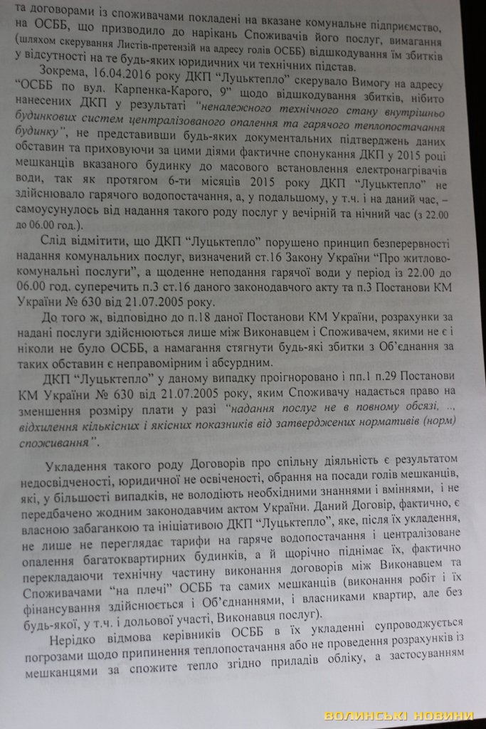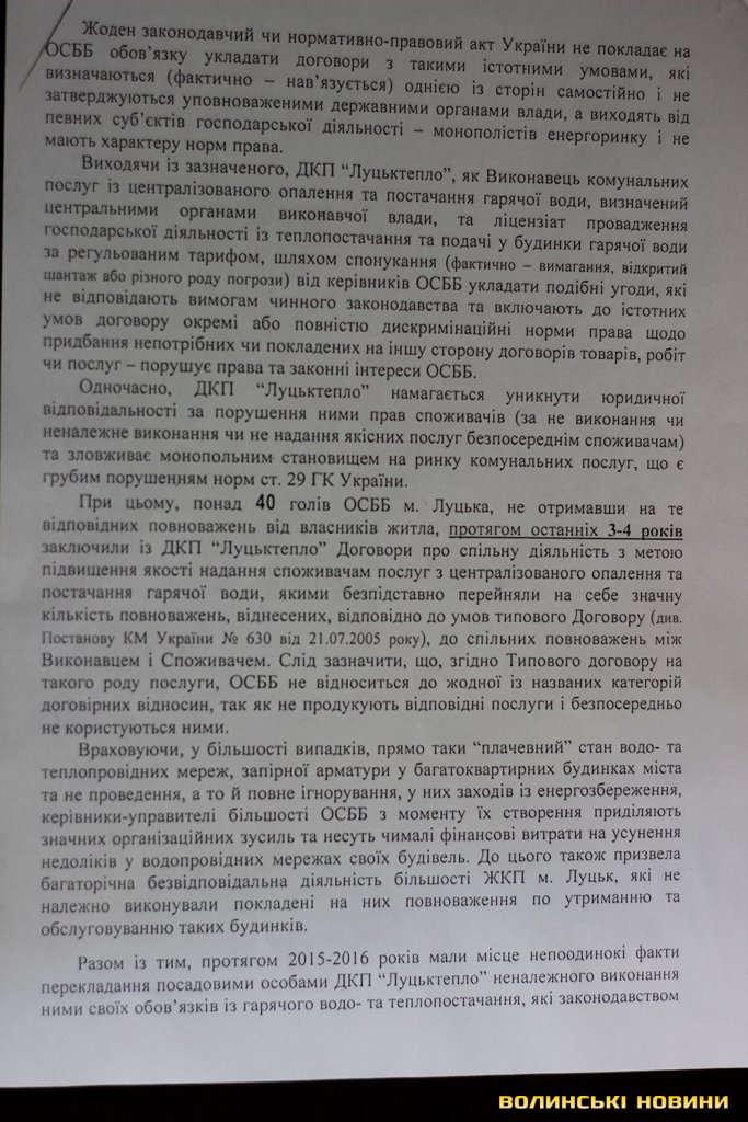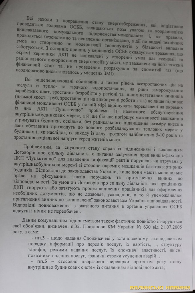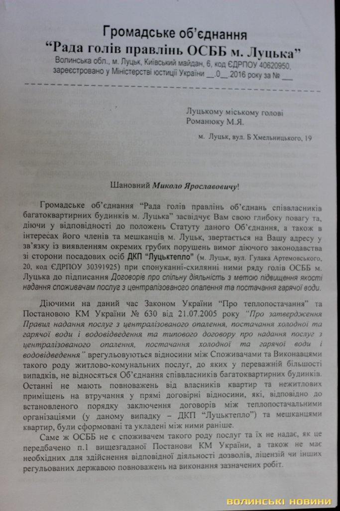 «Об’єднання звертається на Вашу адресу у зв’язку із виявленням окремих грубих порушень вимог діючого законодавства зісторони посадових осіб ДКП «Луцьктепло» при спонуканні-схилянні ними ряду голів ОСББ міста Луцька до підписання договорів проспільну діяльність