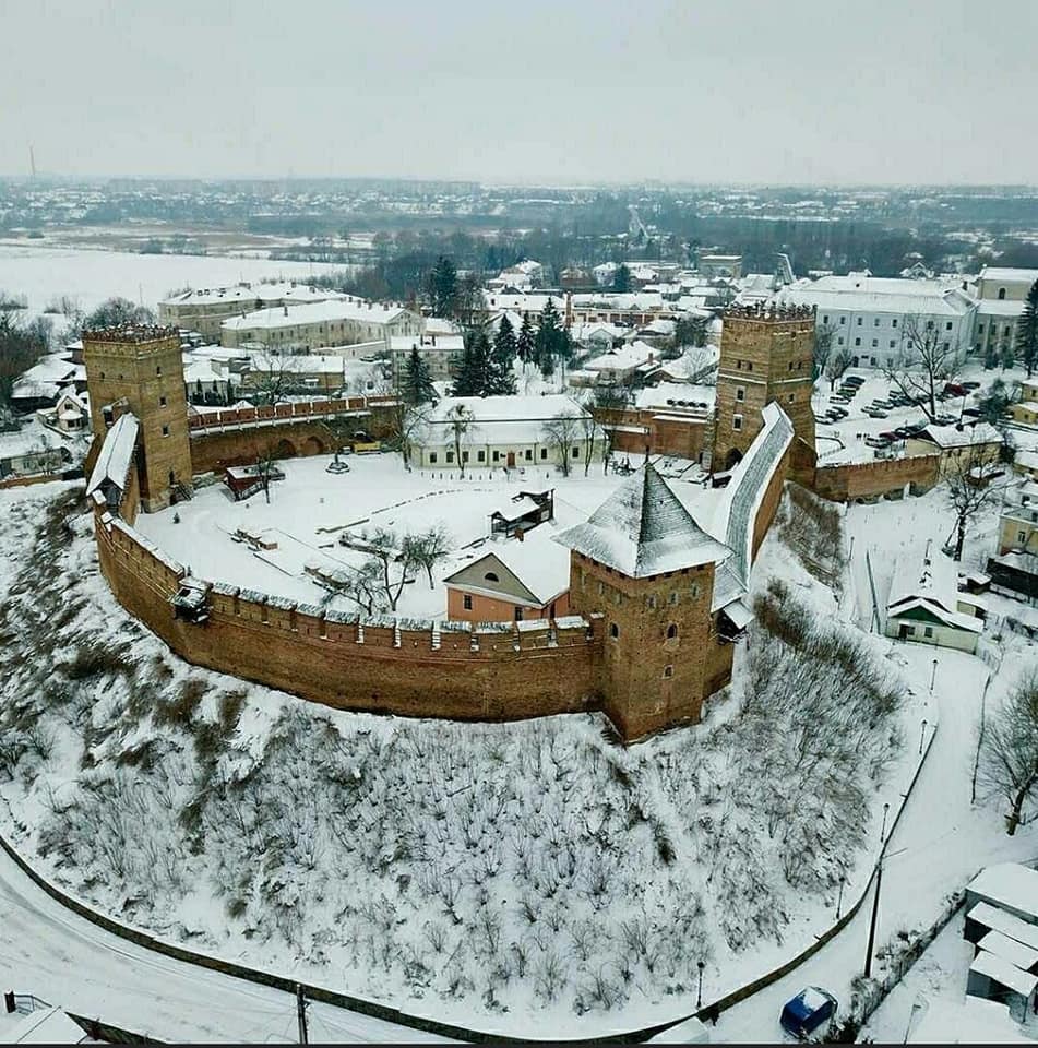 На фотографіях, зроблених з висоти пташиного польоту, видно засніжені вежі та мури замку, а також припорошений "білими мухами" внутрішній двір.
