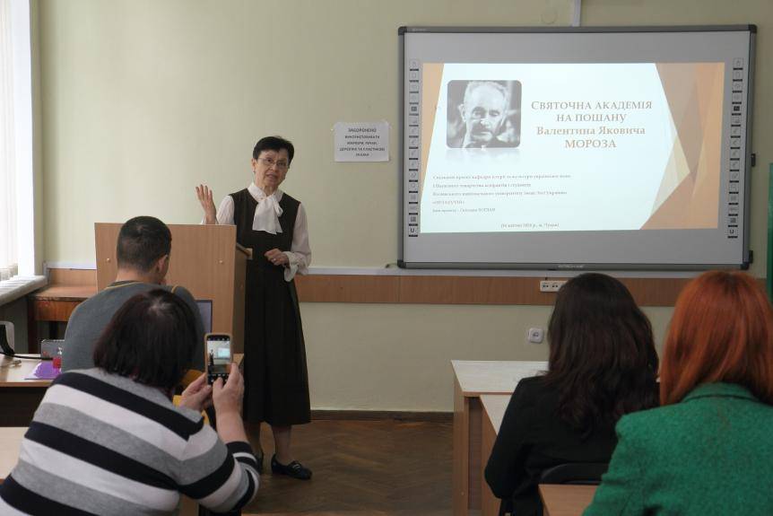 «І поміж тим 15 і 16 квітня вміщується цілісінький огром життя людини, для якої три основні іпостасі були вектором її життя. Ці слова завжди асоціативно пов’язані з його іменем – Україна, нація і мова. Він писав: «Україна – і є символ моєї віри. Символ моєї віри – Шевченків «Заповіт»: «Свою Україну любіть, любіть її во врем’я люте». «Нація, – писав він, – це найсвятіше. Мій народ – окраса землі, мій народ – з Божого лука, він – богообраний. Так говорить моє серце. Розум мій каже, що всі народи рівновеликі, але у кожного з нас кожен народ – особливий». Власне тому він пояснює, що «Бог для того й створив землю круглою, щоб кожен міг вважати свою країну центром планети, щоб кожен стояв на найвищій вершині, відчув себе велетнем, Богу рівним. Тільки так виростають повноцінні люди і повноцінні нації», – сказала на початку дійства Світлана Калениківна, процитувавши Валентина Мороза.Модераторка заходу зазначила, що спільний проєкт кафедри історії та культури української мови і Наукового товариства студентів та аспірантів ВНУ імені Лесі Українки «НЕЗАБУТНІ» дозволяє видатним людям, які відійшли у Вічність, своїм словом і духом додавати кожному наснаги.