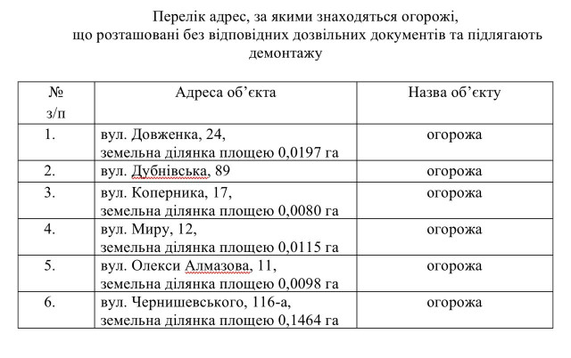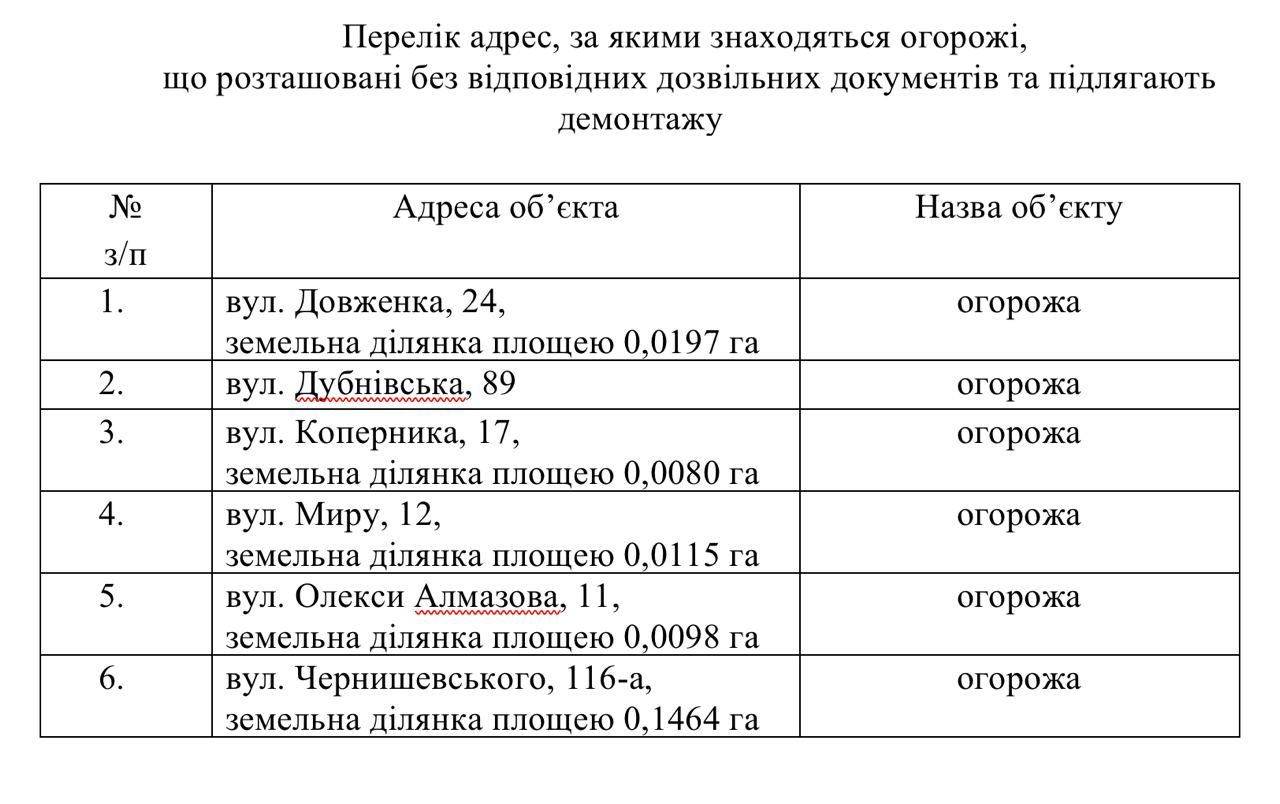 Окрім того, на виконкомі вирішили демонтувати низку огорож: на вулиці Довженка, 24, на вулиці Дубнівській, 89, на вулиці Коперника, 17, на вулиці Миру, 12, на вулиці Олекси Алмазова, 11, на вулиці Чернишевського, 116а.