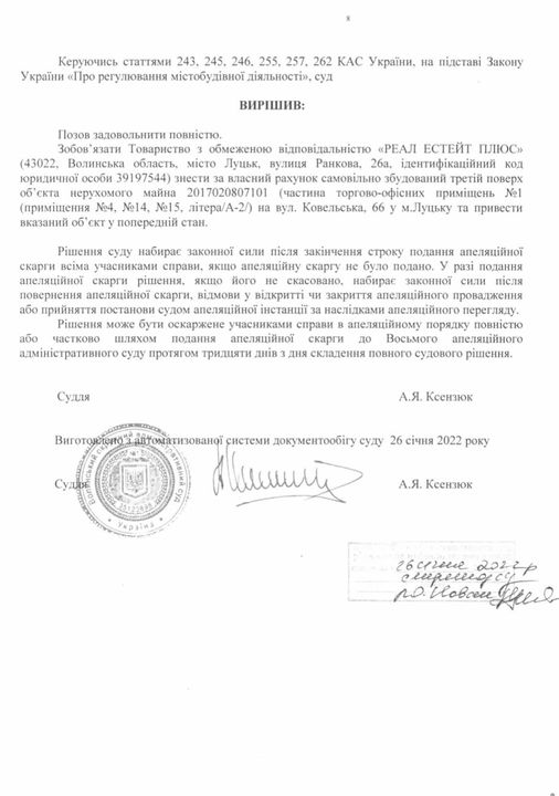 Як зазначив, суд постановив зобов‘язати знести за власний рахунок самовільно збудований третій поверх торгово-офісного приміщення по вул. Ковельській, 66.
