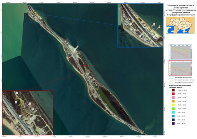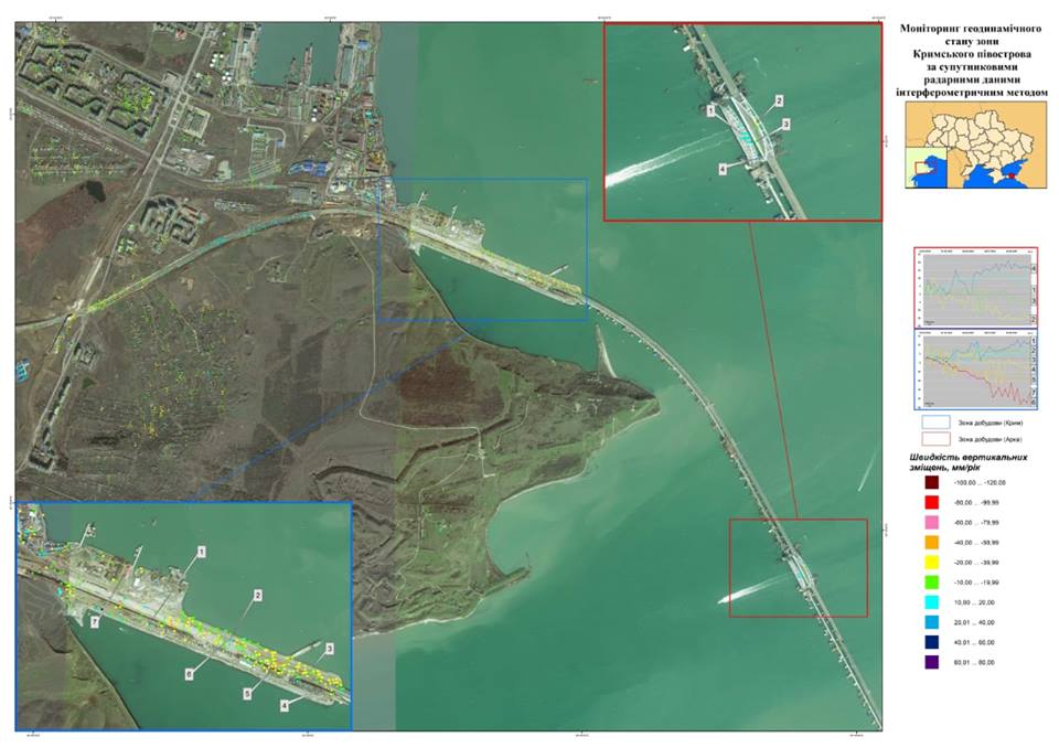 1. У районі штучного насипу з боку Кримського півострову відмічаються об’єкти з вертикальними зміщеннями зі швидкістю від 89 міліметрів (просідання) до 52 міліметрів на рік (підняття) (графік у синій рамці).