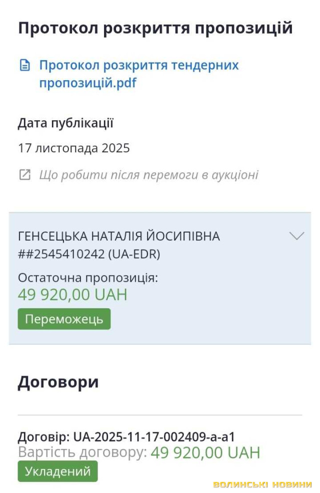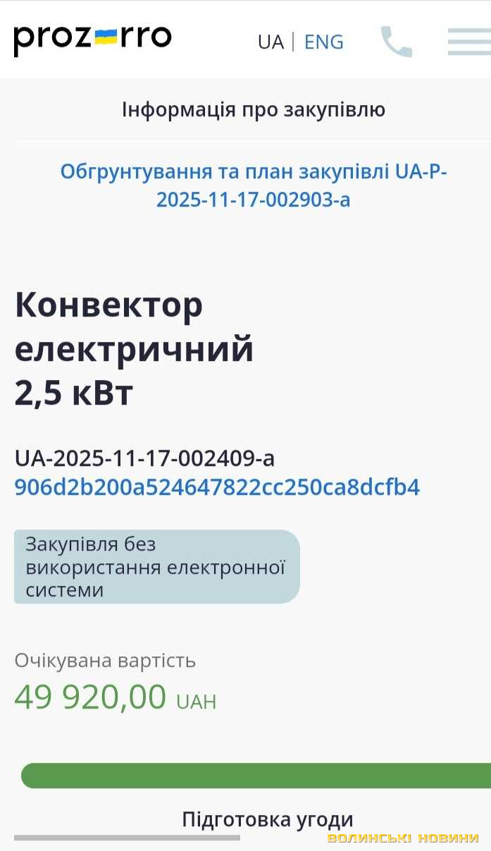 Відповідно до інформації з Prozorro, селищна рада придбала 20 електричних конвекторів, які вартували місцевому бюджету 49 тисяч 920 гривень.Тендер виграла місцева підприємиця Наталія Генсецька.