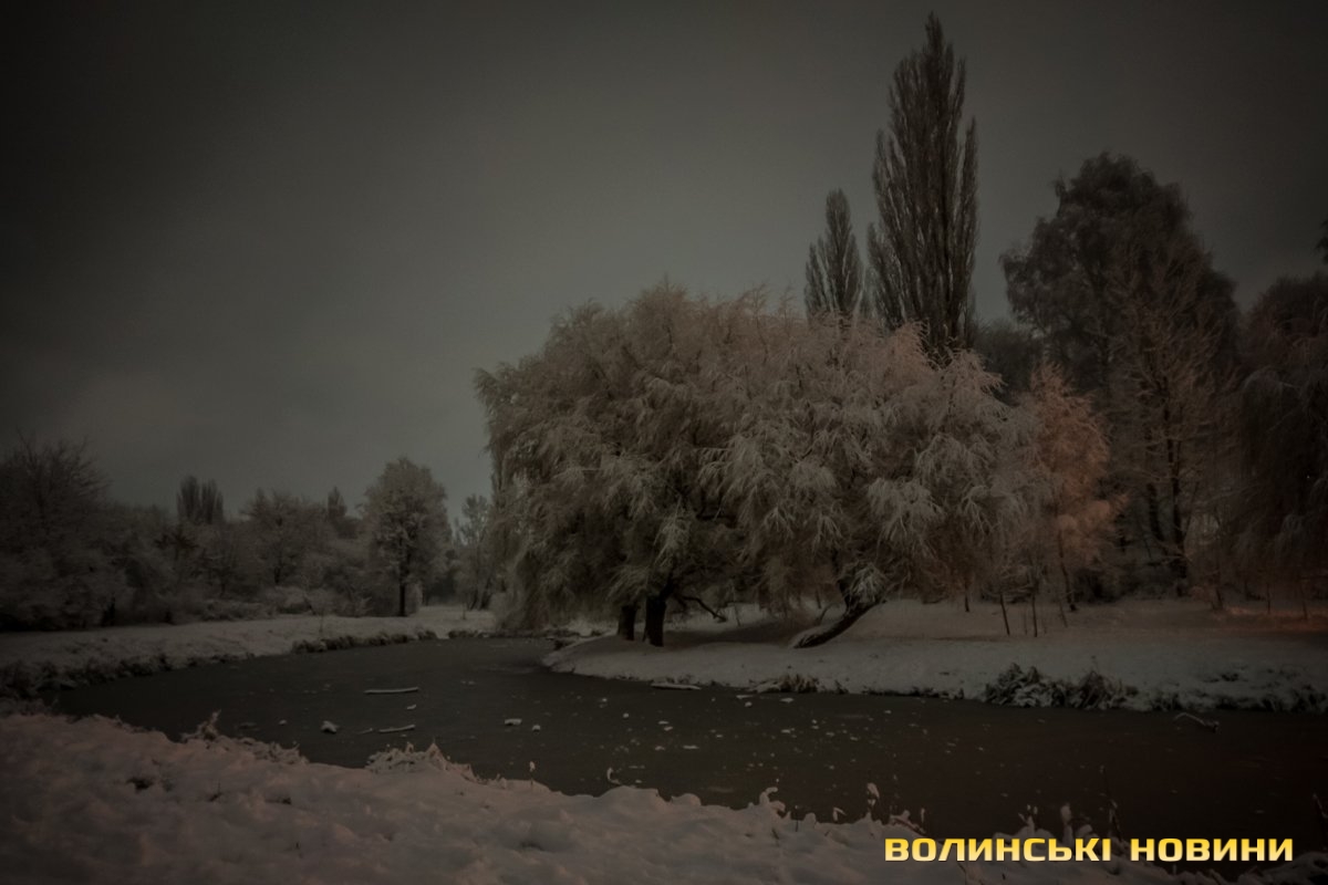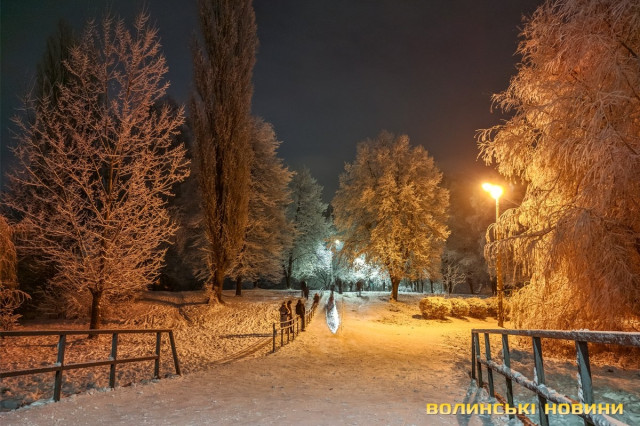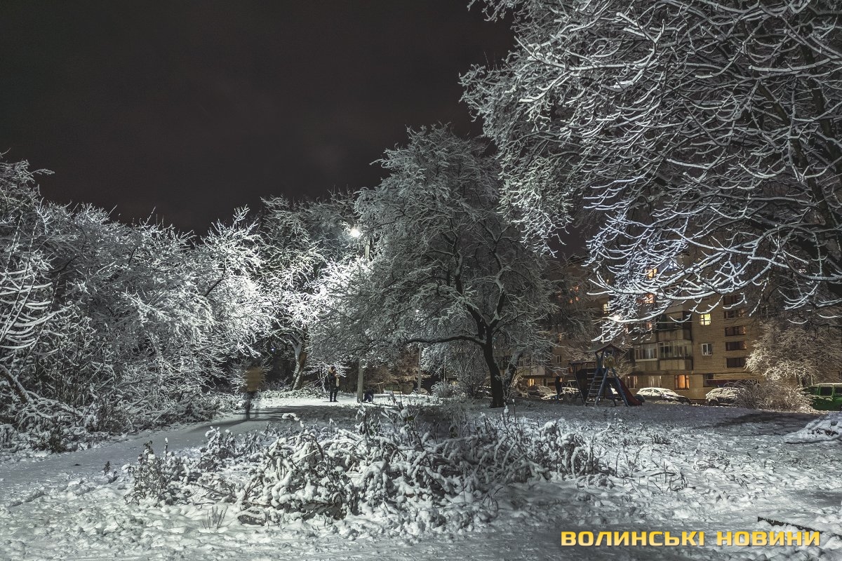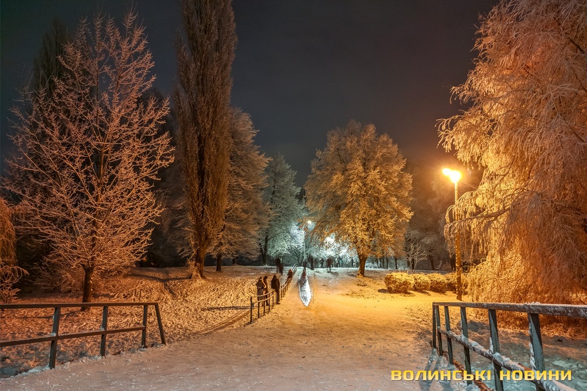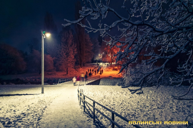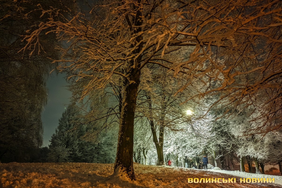 З самого ранку над Луцьком нависали важкі сиві хмари, а вже після обіду місто почало вкриватися пухнастим килимом. А вечірня пора надала засніженим вулицям і парку особливої атмосфери.