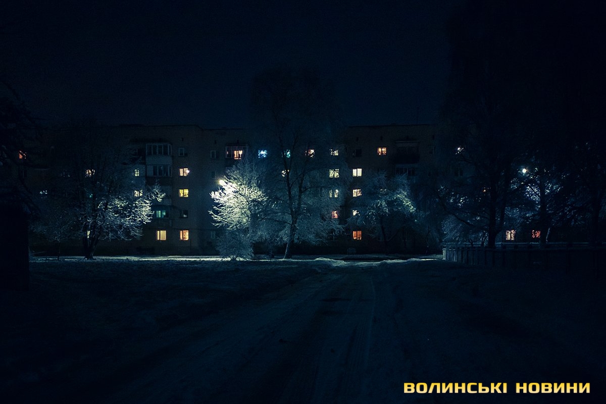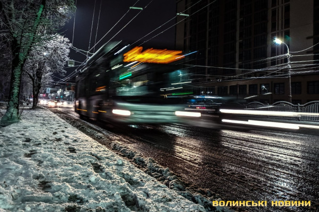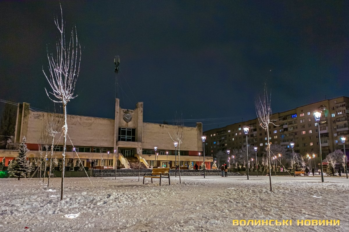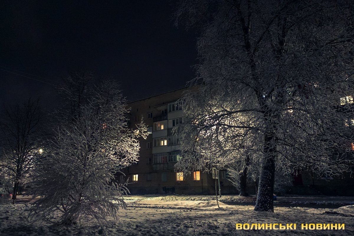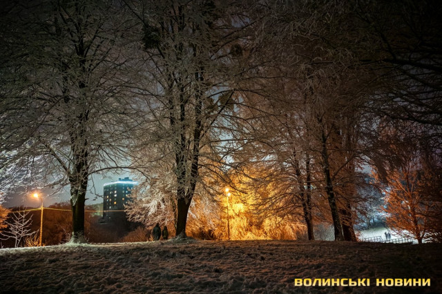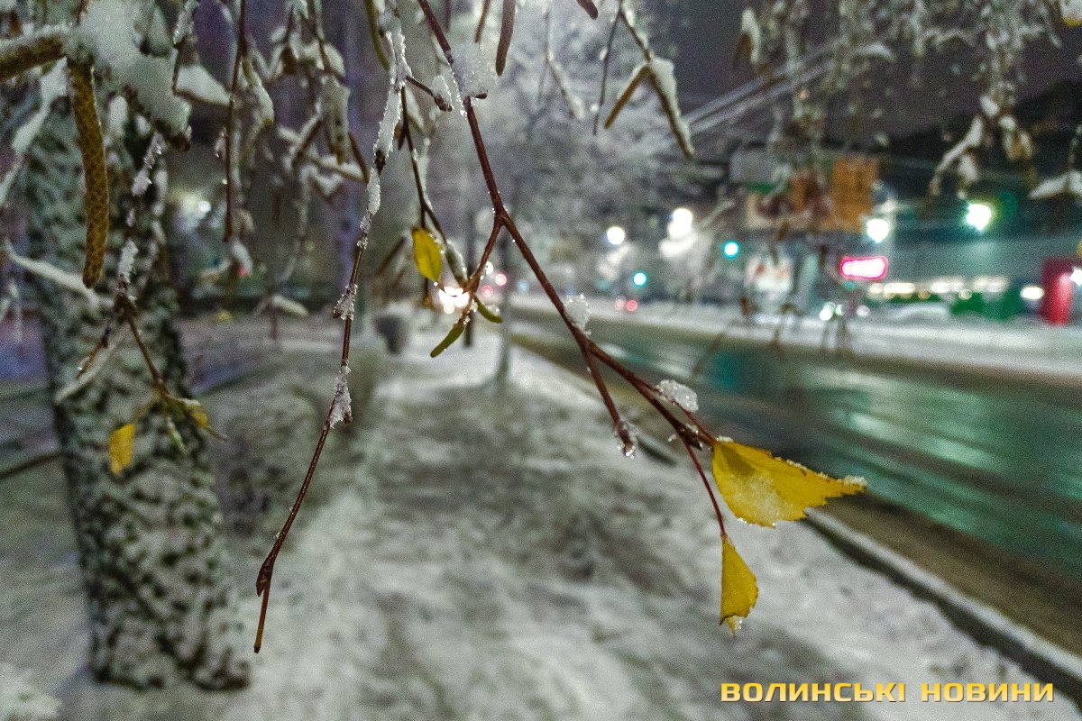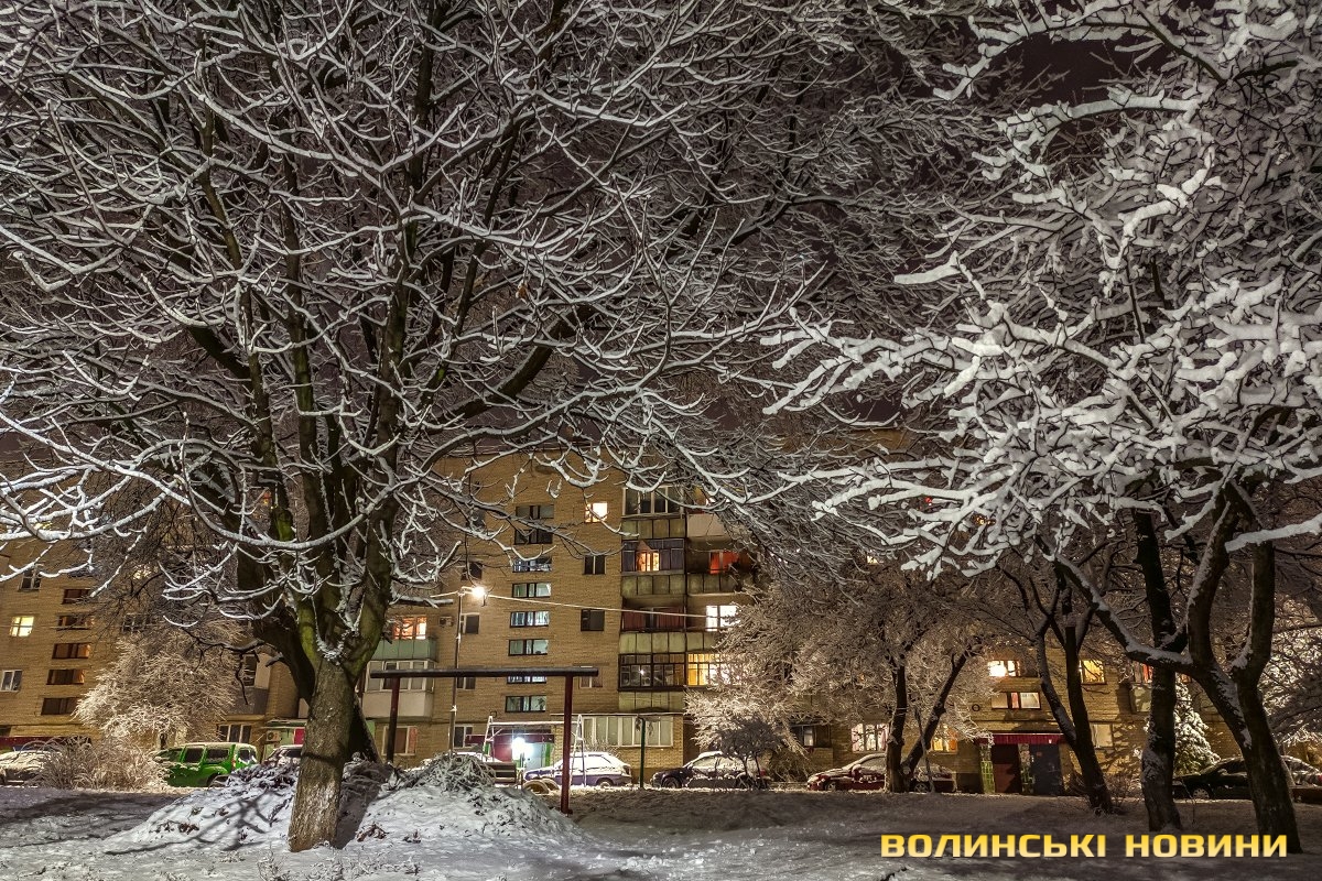 З самого ранку над Луцьком нависали важкі сиві хмари, а вже після обіду місто почало вкриватися пухнастим килимом. А вечірня пора надала засніженим вулицям і парку особливої атмосфери.