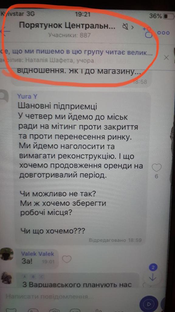 «Ніяких мирних протестів» і погрози підпалу авто: що пишуть підприємці в чаті «Порятунок Центрального ринку»