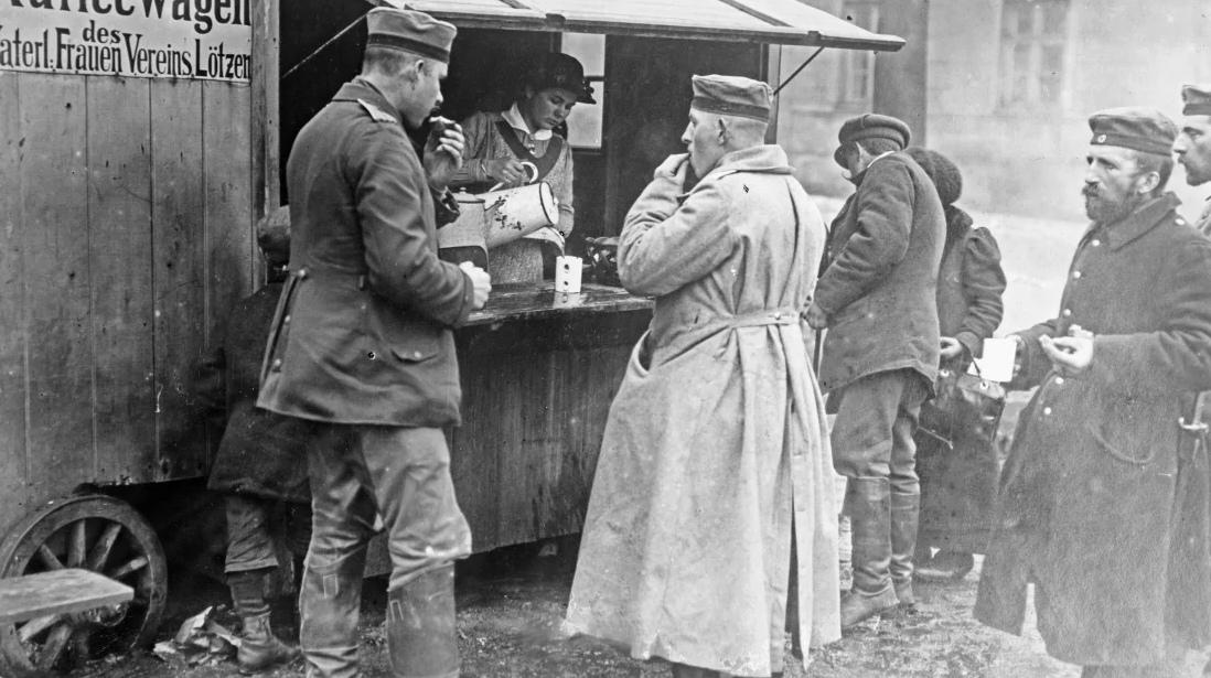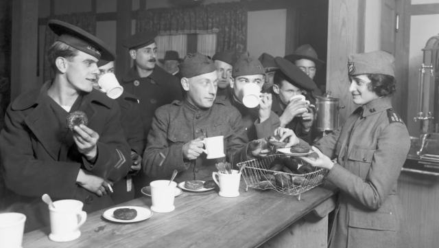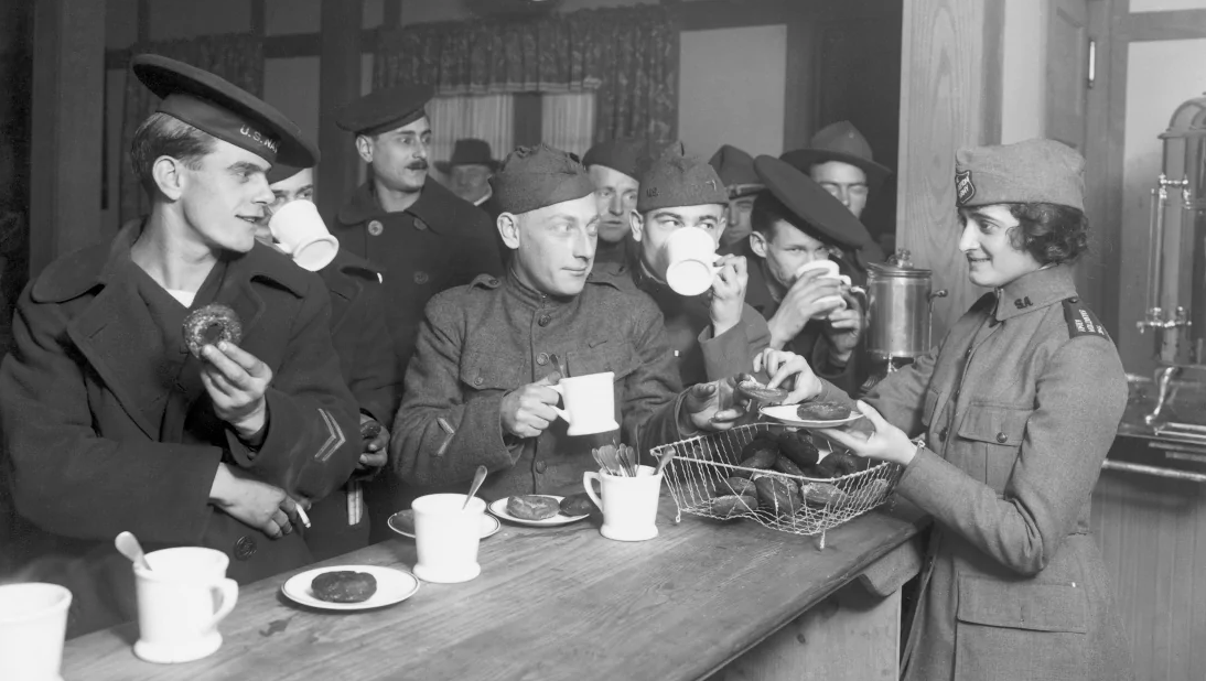Один із армійських високопосадовців після війни зробив висновок, що «кава була так само важливою, як м’ясо та хліб, адже вона відновлювала мужність і силу та підтримувала бойовий дух».Американські солдати пʼють каву з пончиками, 1918 рік