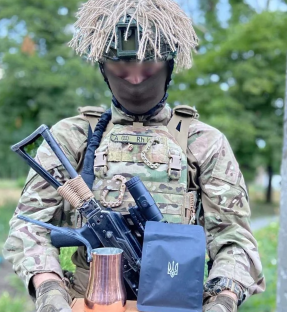Український боєць, який отримав каву та джезву
