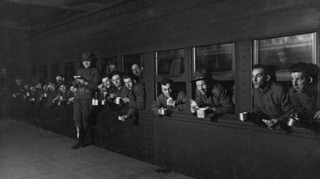 Американські солдати з бутербродами та кавою перед відправленням до Франції під час Першої світової війни, 1918 рік